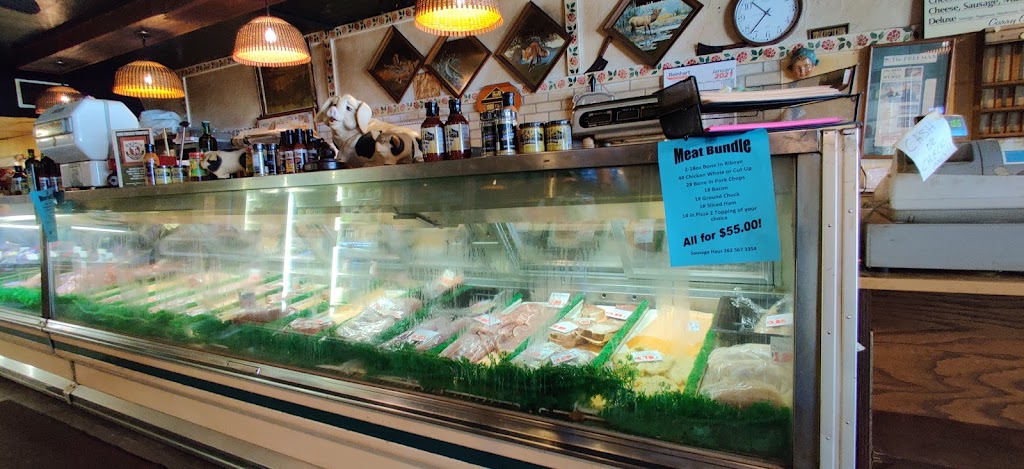 Small Butcher shop specializes in quality sausage and meat. Delicious pulled Pork sandwiches.