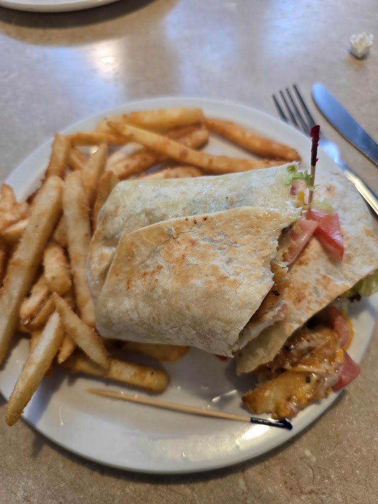 Met up with family, and 3 of the 5 adults got horribly sick later on in the day, having only eaten here all day. I found a piece of a wooden skewer in my wrap once I got home, too. There was no sign that a skewer had been used to hold the wrap together. Waitress was friendly, but she was overly concerned I didnt like my wrap, too, which was odd at the time, but has come to my attention that our waitress was the owner so makes more sense. Food was very slow getting to table and came out in 2 groups almost 10 minutes apart. Place was not overly busy, just maybe 2 or 3 other tables.