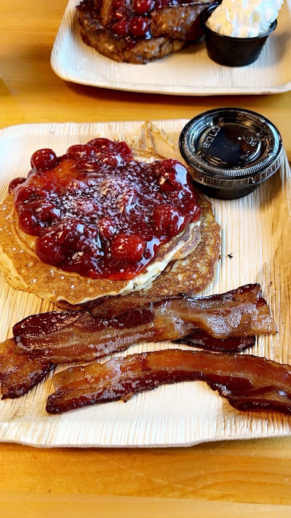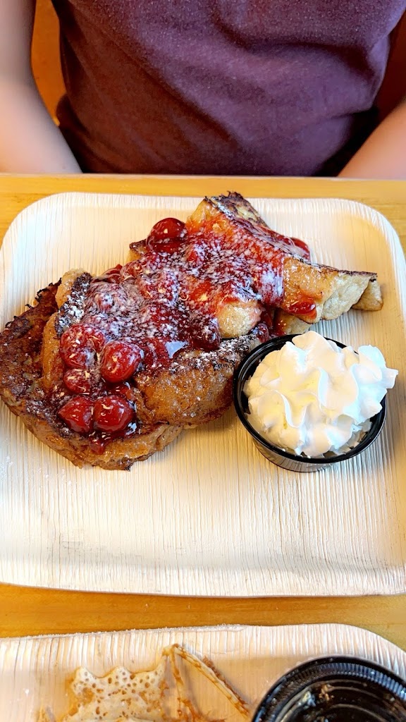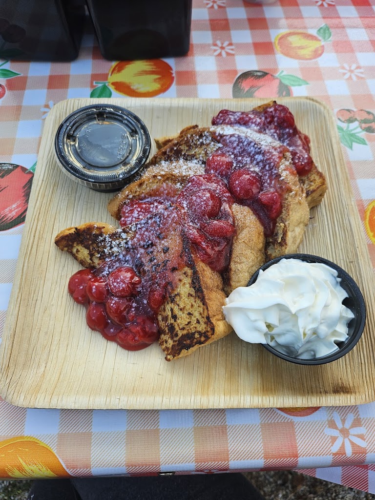 The staff here are extremely friendly, it feels like a family operated restaurant. The French toast is the thing that was mentioned as being the most popular or the best so we got that for the kids and for myself and it is indeed very good. Large pieces of fluffy bread toasted to perfection crispy on the edges and you can get it with cherries and whipped cream which is really delicious it's kind of like a tart pie filling. Even though the kids like sweet things for some reason they feel like the cherry topping isn't too exciting but I think it's incredible I absolutely loved it.