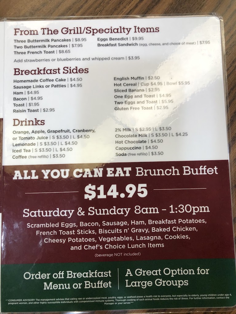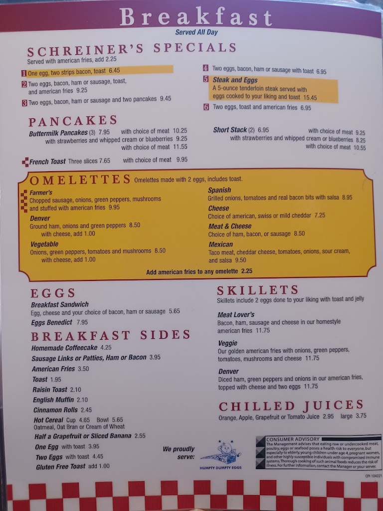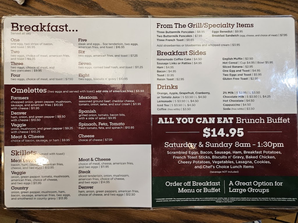 Great food, great price! Highly recommend it. We are at a couple other local breakfast places and they weren't as good!