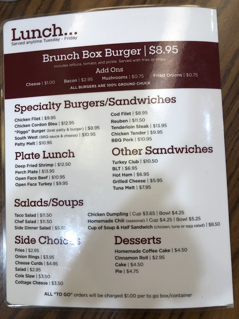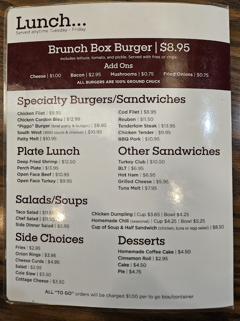 Now named The Brunch Box. Food was great! Stopped in on a Sunday where they had a buffet - lots of choices. Very friendly owner and servers with quick service.
