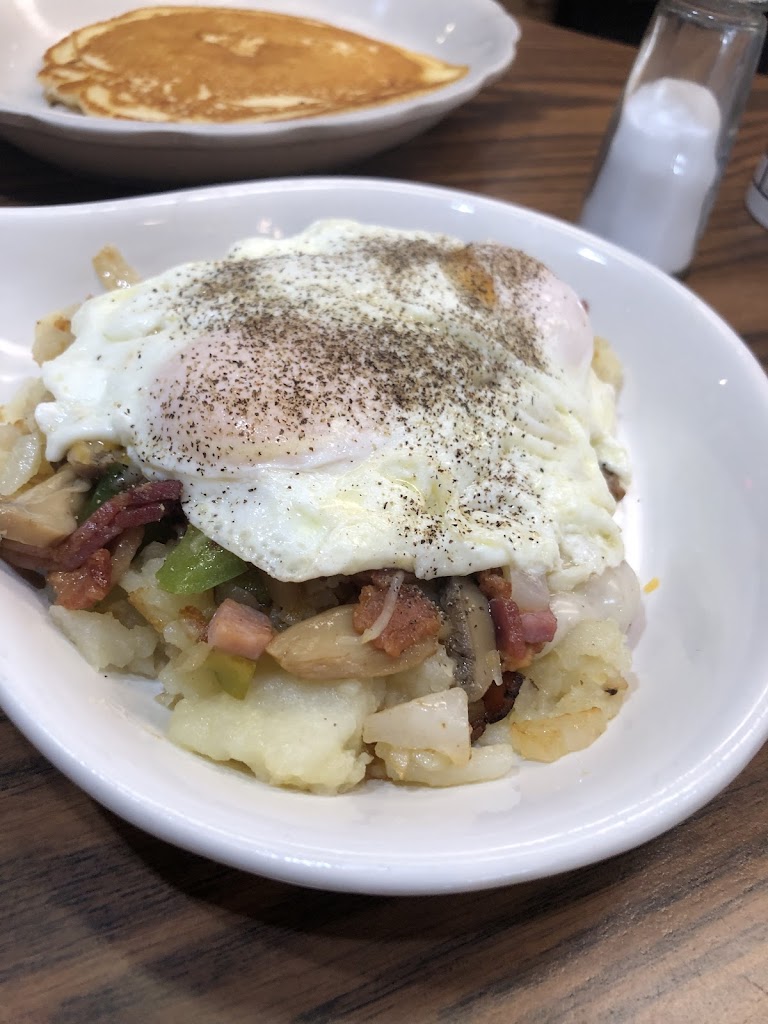 Walking in at 10:30 AM on a Sunday morning (hours of operation 6am -1pm) and were immediately sat, by choice, at the counter. This was a surprise as we expected a wait due to entering during a popular brunch time. From our view, we could watch the line cook hard at work, taking careful consideration to each order in which they were placed. The owner was friendly and quick with a joke but also ensured his staff was taken care of - offering multiple times to help with tasks. Our waitress was friendly and checked on us multiple times, engaging us in small talk to get to know a little bit about us. We ordered breakfast number three, which came with two pancakes, easily 8 inches in diameter, two eggs and your choice of meat. We chose the bacon and it was delicious, perfectly prepared. The second entrée was the all meat skillet with choice of eggs and toast. I chose over easy and they were exactly as I wanted. The portion sizes were perfect for our appetite & pocketbook. For a mother-son in town for the national bowling tournament, knowing nothing about this diner, I would highly recommend it to anyone! When we return to this area, it will definitely be a breakfast/brunch stop!