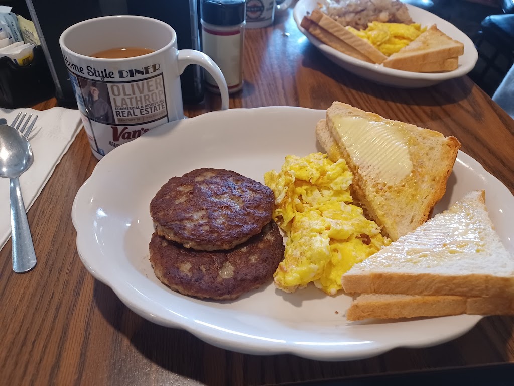 Stooped in for breakfast had 2 eggs overeasy with sausage links white toast and home fries with onions. Restaurant was clean, people were friendly and helpful. The food was great salt and peppered eggs and eat them down. Found out they made their own pies so had to try one went with banana cream pie, crust was flakey and tasted great and so did the filling. Definitely worth the trip