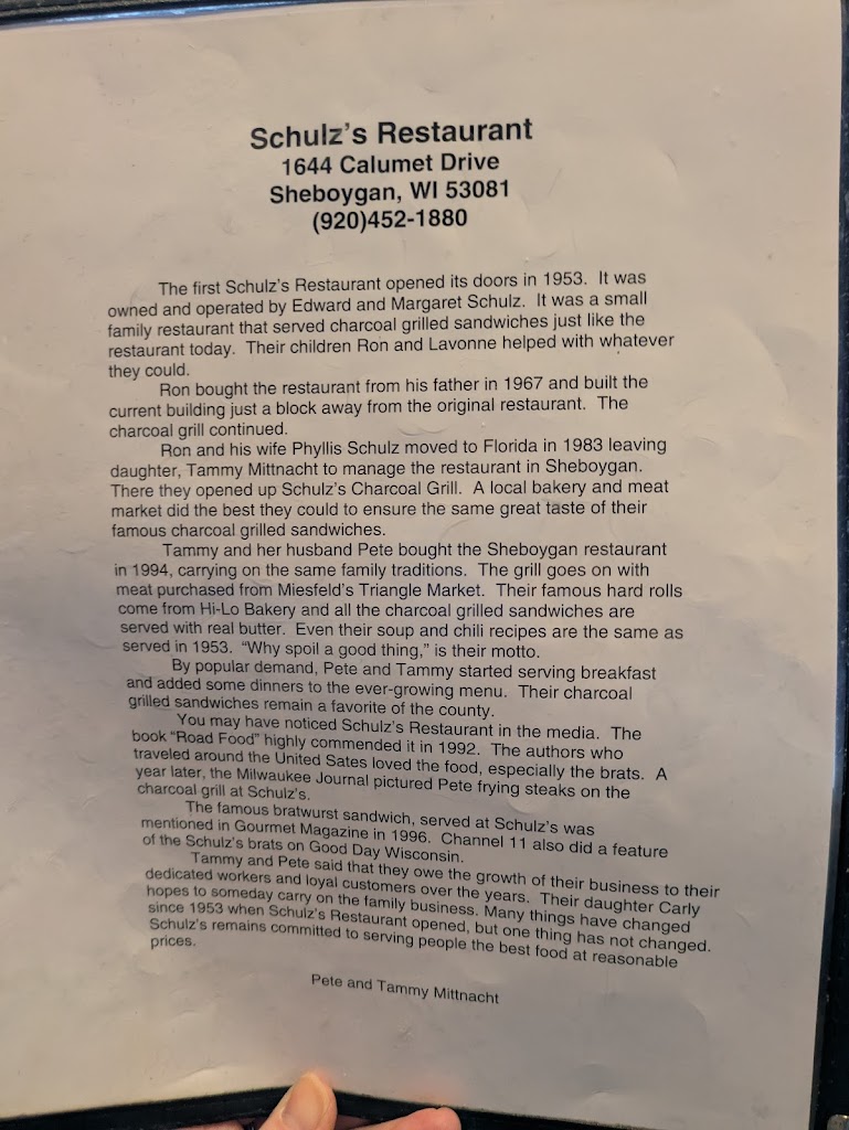 My mom grew up in Sheboygan, and every time we visited, we'd stop at Schulz's for a burger. We are carrying on the tradition -- delicious burgers and fries, fast service, and you can't beat the prices. Yum!