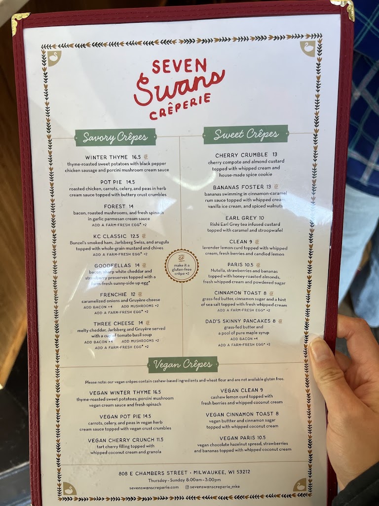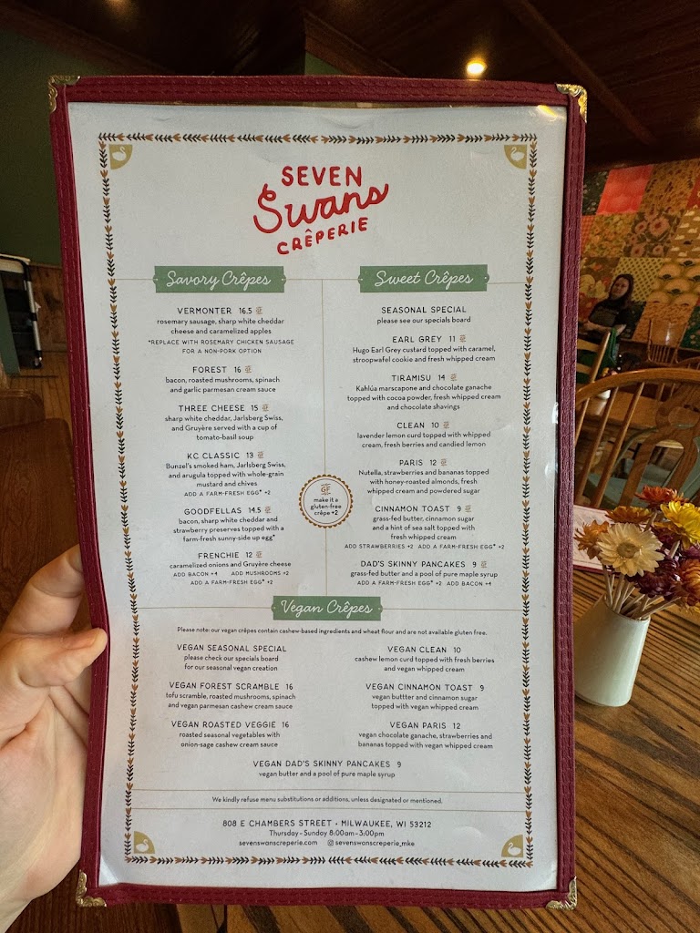 Enjoyed a wonderful lunch at Seven Swans. The restaurant requires you to order your food at the counter, and they will bring it to your table. All of the staff were so friendly and helpful. The specialty coffee was hot and delicious and served promptly. I had the bruwer and onion crêpe, which was fabulous, and has me wanting to go back in order the exact same thing! Next time, I will go with more of an appetite, and sample one of the sweet crêpes as well as they look delicious!! This restaurant is a wonderful gem in the heart of Riverwest.