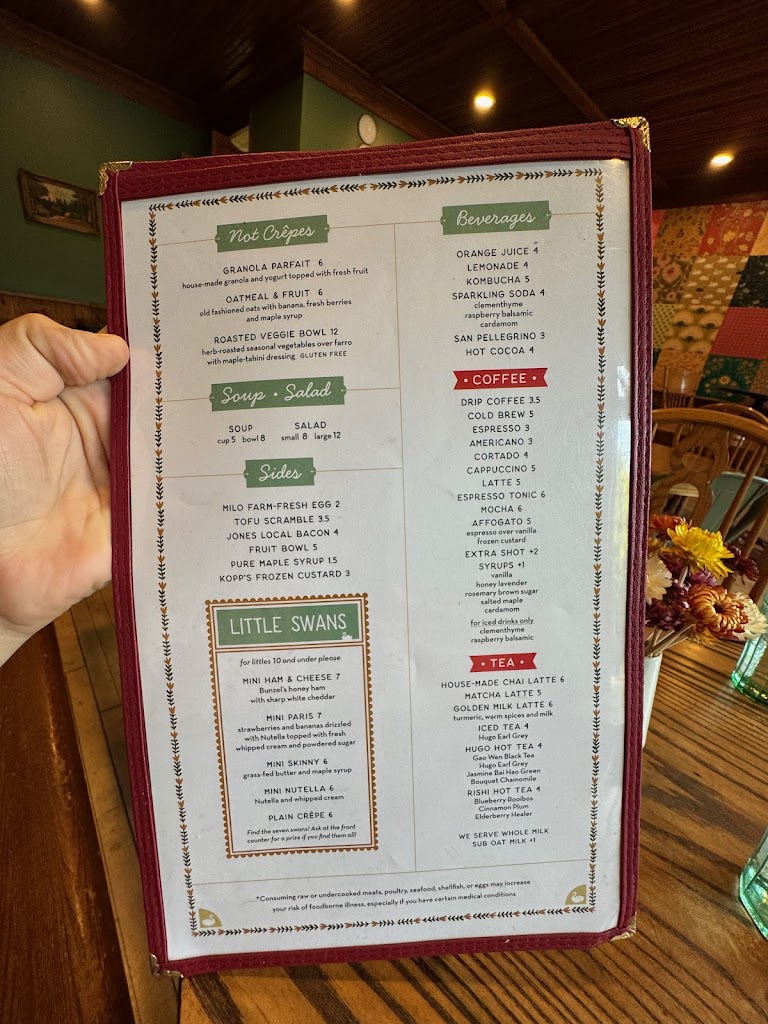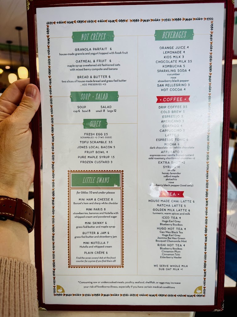 Beautifully decorated, scrumptious crepes, friendly staff, and you get a special prize if you find the 7 swans - which was a fun diversion for my 4 year old. Appreciated the hours open on Thanksgiving, as we don't celebrate it but I still got a taste of it with the leftovers crepe.