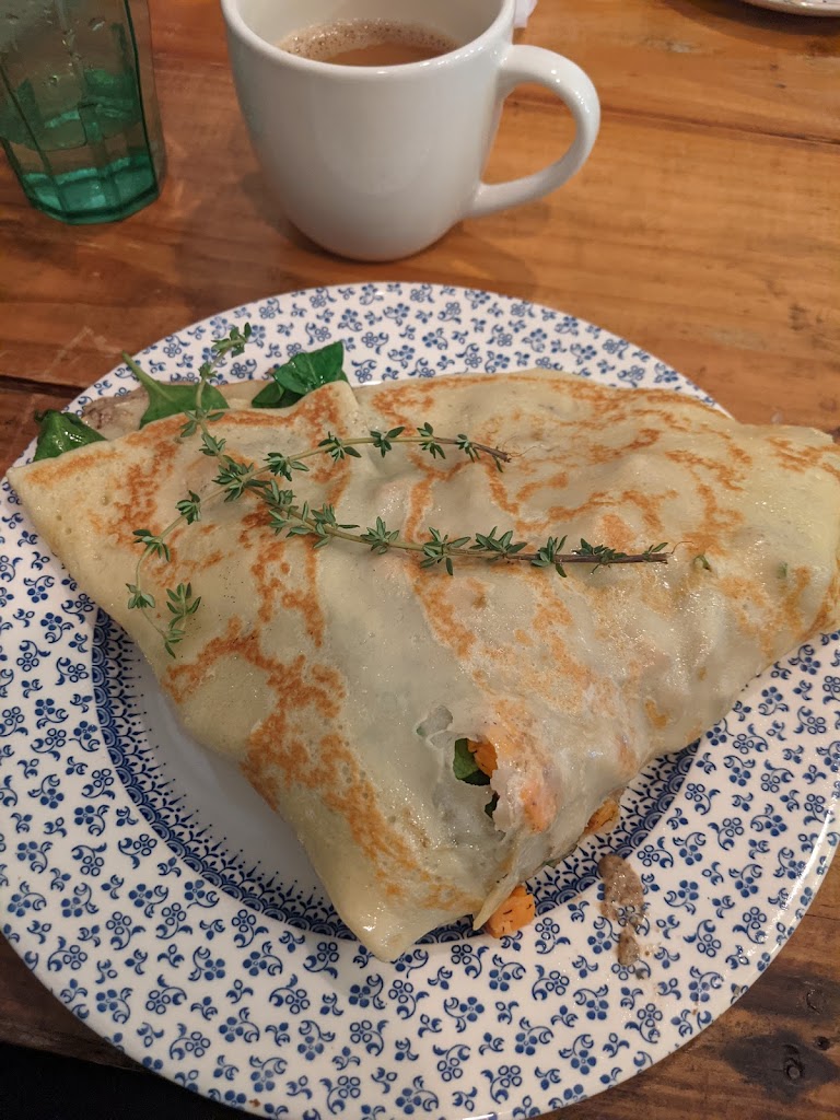 First time here and was a nice surprise. Went around 830 on a sunday morning and wasnt too busy. Orders are taken at the counter and coffee they carry Ruby's coffee which was also a first for me. Coffee was good, atmosphere is warm, inviting, enjoyed our food. We tried the vegan autumn roasted veggie crepe and a sweet vegan Paris crepe. My wife and I enjoyed both.