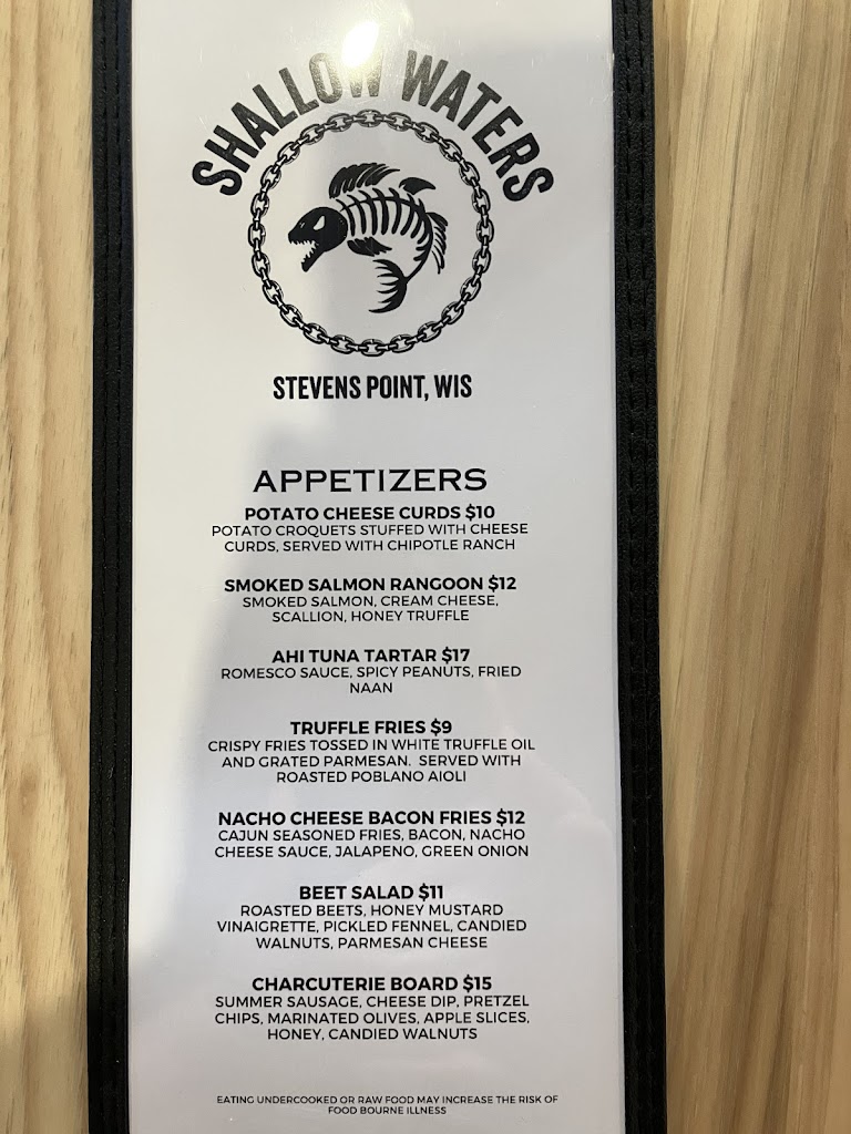 Shallow Waters is a beloved American restaurant in Stevens Point, WI, that delights locals and visitors alike with its diverse menu offerings. Our specialties include classic potato cheese curds, flavorful beet salads, succulent NY strip steaks, and exquisite tarragon Dijon crusted halibut, and our signature drinks perfectly complement our dishes. Beyond dining, Shallow Waters is a vibrant hub offering a dine-in experience, weekly specials, takeout options, event hosting, adult gaming, live football games, cribbage tournaments, and gift cards. Come immerse yourself in the inviting atmosphere of Shallow Waters and savor a dining experience like no other.