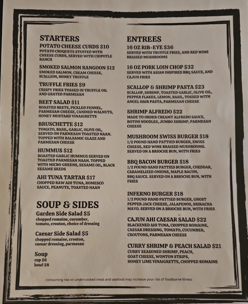Small but creative and delicious menu. Potato cheese curds are interesting and well-presented. Spicy Shrimp and Peach salad was a delight of interesting flavors that worked so well together. Shrimp and Scallop angel hair was tasty without being overwhelmed with lots of sauce.