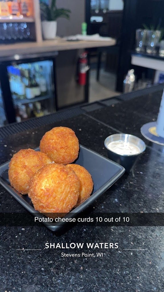 I absolutely love exploring new food spots! I recently did a bit of digging and discovered this charming place called Shallow Waters. The potato cheese curds caught my eye—they looked incredible! It’s about a 40-minute drive from Waupaca, but trust me, it's totally worth it. When we arrived, the place was super cute and had such a great vibe. Kyle, the bartender, was super friendly, and the service was fantastic. I highly recommend checking it out! Plus, there was a train passing by that added a lovely touch to the whole atmosphere.