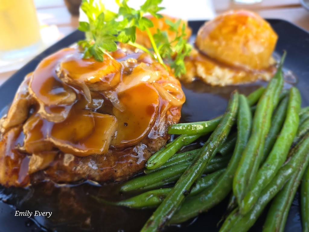 We had the Monday night special. Chopped steak with real mashed potatoes. We sat outside on the deck.