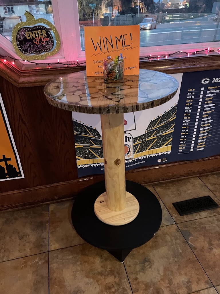 Huge parking lot. Dined on a Thursday at noon with 4 people. Seemed like the bartender was also the waitstaff, but she did well. Beautiful tables in the dining section, but the non-hightop tables had wobbly tops.