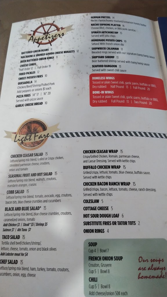 One of our favorite places to relax. I love the deck’s view of the water.Guests are ALWAYS greeted with a smile, even if the place is packed. Friendly service all around. The bathrooms are clean. The food is fresh and hot. Don’t miss Friday Fish. We love the Pizza, Nachos and Wraps too. Shipwreck has earned all five stars in food, service and atmosphere. Don’t miss the fun! Oh, and … it’s kid friendly but you never seem to notice an unhappy ones!