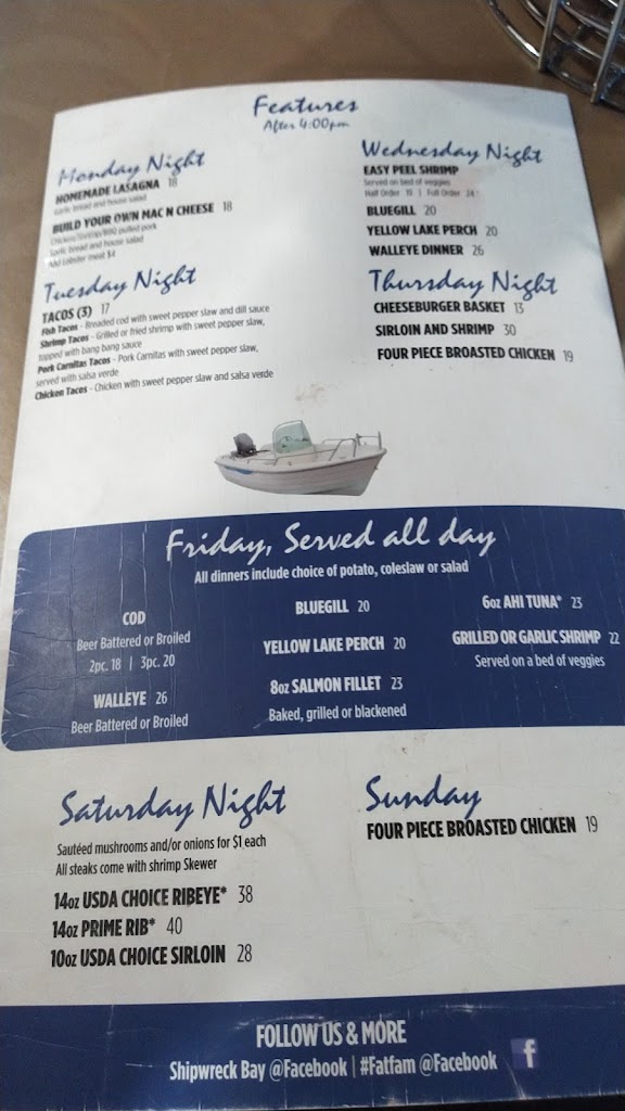 Shipwreck Bay is the "Cat's Ass" for excellent service, mouthwatering food and friendly people. This is a very clean beautiful setting and their waitresses are spot on. Everyone deserves a trip to Shipwreck Bay. Will definitely go back there many many times.