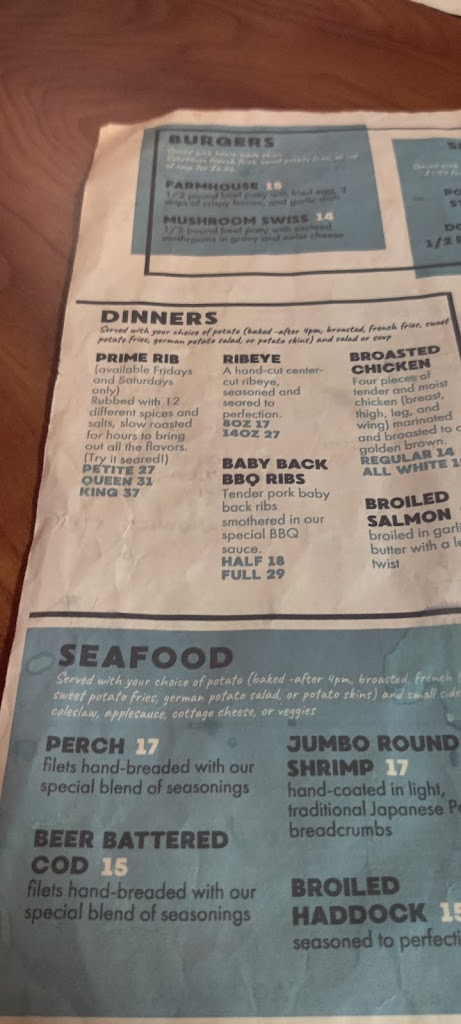 Great portions!! Excellent food. We had the farmhouse burger which was delicious!! The kids meals are perfect portions and they loved the cookies. The bone in chicken wings are great!! Perfectly cooked and seasoned!! The chili is fantastic. The french onion soup is perfect. The staff is friendly and attentive. A true diamond in the rough here in sheboygan!! We will definitely be back!!