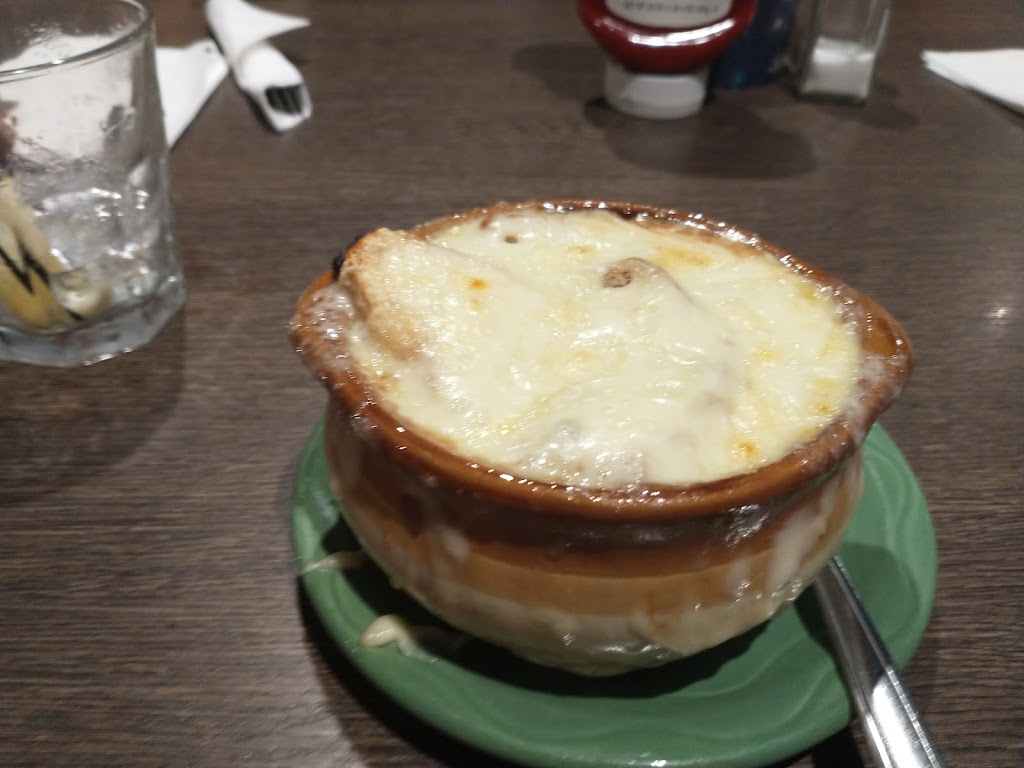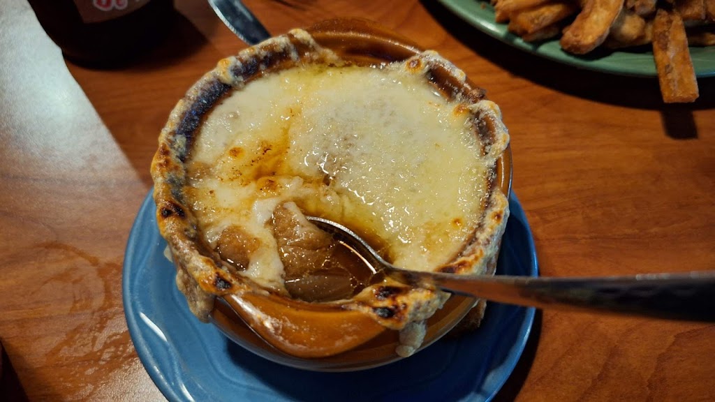 It was our first visit. I love baked French onion soup and eat it frequently. I ordered it here, and it was one of the best bowls I have had. It's really good... The pub burgers were tasty. My wife, who is very particular with food, really liked the open face prime rib served rare. It was such a large serving that she had some to bring home. Our waitress was very nice and the order was perfect. It was affordable, and we will return at some point.