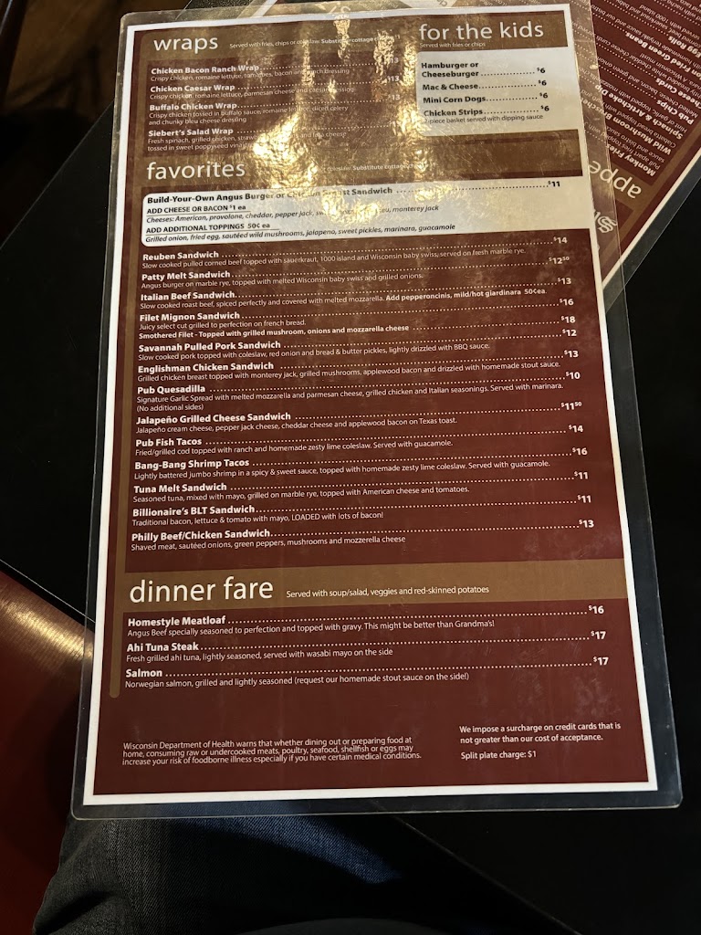 My friend suggested this restaurant for great food - and yes, it's a pub, and yes, the food was great. We ordered the Ahi Tuna WonTon Nachos appetizer and it was superb. Real wasabi, not green powder! I ordered the Asian Ahi Tuna with roasted vegetables and wasabi mashed potatoes. When I return, I will order the appetizer as my main course. While the vegetables and mashed potatoes with the dinner were very nice, the appetiser was out of this world good and had far more interesting accompaniments. My husband had the Italian Beef, and said it was quite good. I nabbed a few of his fries and wow - they were great! He said next time he would like to try one of the many burger options. My friends ordered the Reuben Sandwich (unparalleled!) as he always does when they go there, and my other friend ordered the Prime Rib Quesadilla, which she said was okay but probably wouldn't order again. It was served with a nice horseradish sauce though.