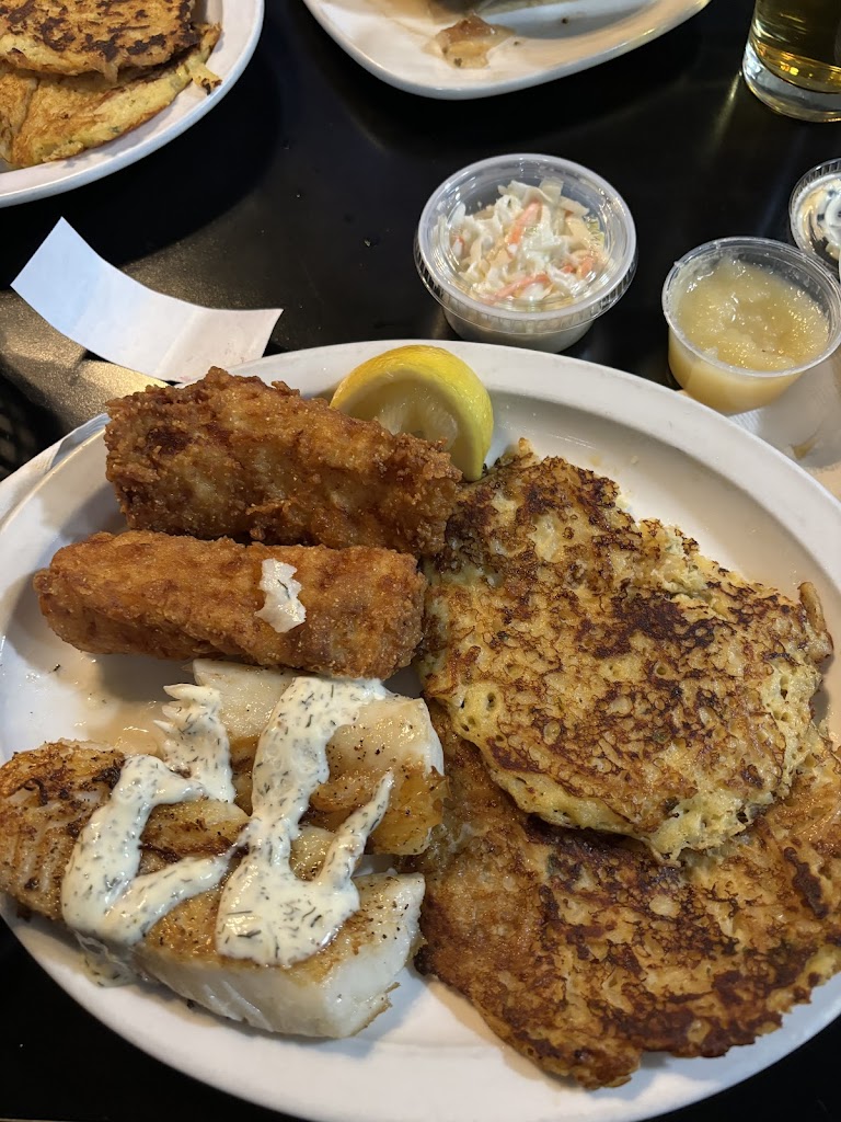 Recently moved to the area and stopped in for lunch. First, try the French onion soup. They brag about it - and they should! Portions are generous and every sandwich I've tried tasted fresh and great. But the Friday Fish Fry - 4 pieces baked cod with potato pancakes, lemon, and coleslaw? We order it all the time and do take out.