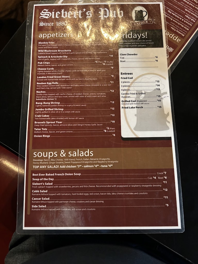Siebert's is a great place to go for high-quality food on a quick-casual budget. Their decor is fun and funky (I'm especially fond of the 70s-era op-art wallpaper!) Their servers are helpful, their menu is diverse and their quality is consistent. Great choices include their melt-in-the mouth sweet potato fries; the baked french onion soup; their rich, hearty mashed potatoes... and then there are the crab cakes which are SUPERB. They are properly seasoned with the crabmeat imparting a wonderful texture. Don't miss their lemon dill sauce accompaniment. Savory quality and local pub vibe make Siebert's a premier choice for fall dining because their hospitality makes you feel warm inside.