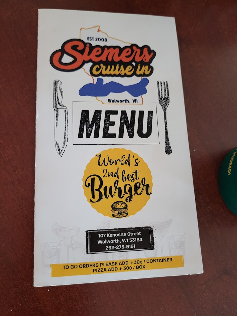 Siemers Cruise-In Bar & Grill, established in 2008 in Walworth, WI, welcomes you to an inviting and vibrant dining experience. Specializing in a delectable array of food and drinks, our menu boasts mouthwatering pizzas, juicy burgers, and flavorful wings. Whether you're looking for a casual night out at the bar, a cozy dine-in meal, or a quick carryout option, Siemers Cruise-In has something for everyone. Serving the greater surrounding area, we invite you to enjoy the friendly atmosphere and delicious offerings at our beloved bar & grill destination.