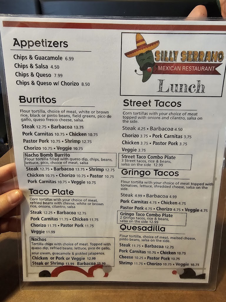 We had the best Mexican / Tex-Mex meal at Silly Serrano's. Loved them while they were next to the Farmers Market. I had forgotten how good their food was compared to other Mexican eateries... Next time you have a craving for Mexican make Silly Serrano's your destination!