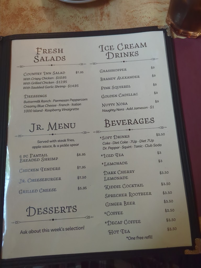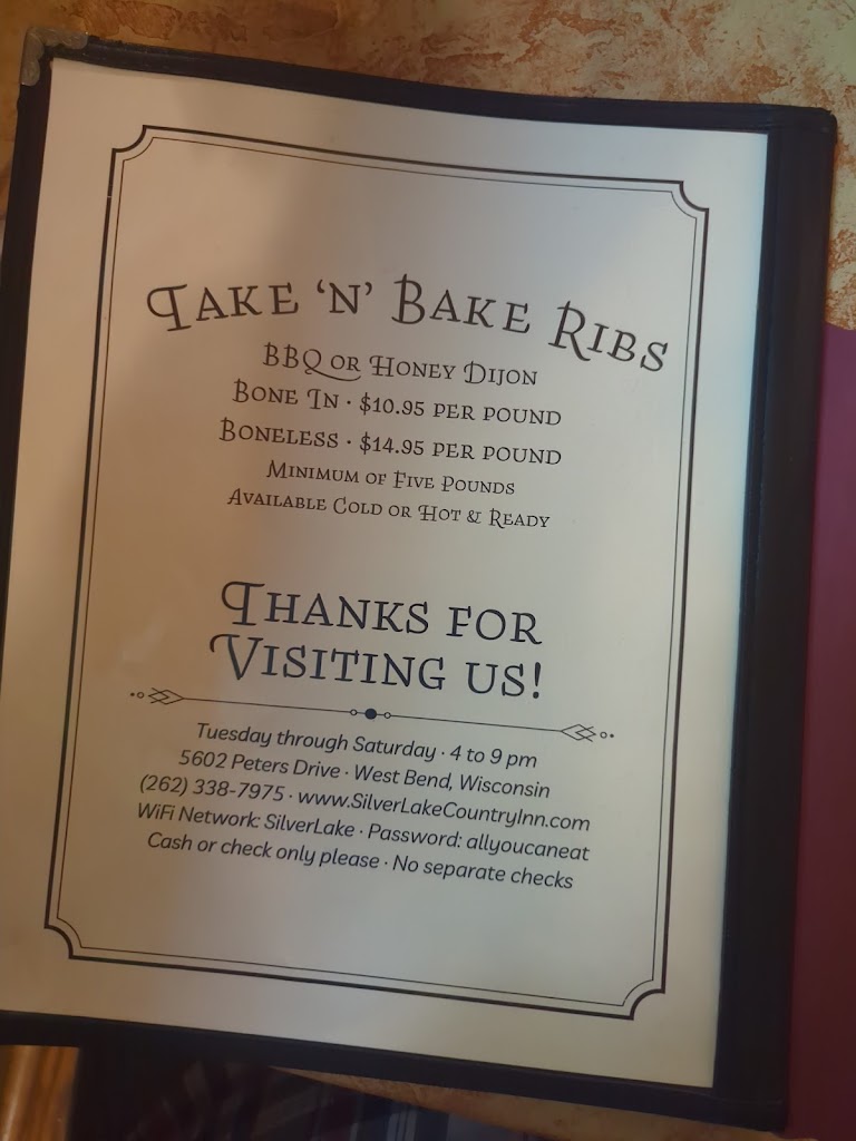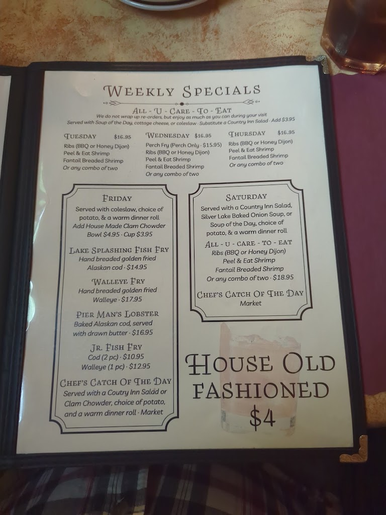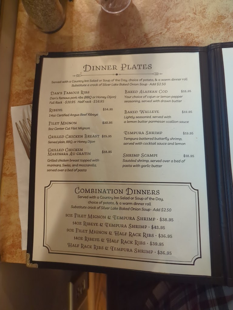 My wife and I went with two of our neighbors for a Friday fish fry. Other than myself, everyone ordered a fish combination dinner, which consisted of a fried walleye fillet, fried cod, fried shrimp, and a crab cake served with french fries or potato pancakes and coleslaw. They were all very pleased with their selection. I opted to go with a full rack of bbq ribs. If you haven't been to Silver Lake Country Inn previously, they are the "falling off the bone" variety and are always excellent. For dessert we ordered grasshoppers, but they have other ice cream drink selections. If you are looking for a great meal at an out-of-the-way location, this is a wonderful place.