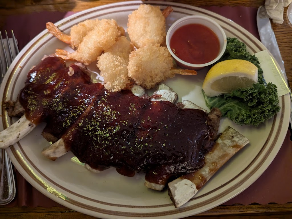 Excellent specials are you can eat ribs, shrimp, and fish Monday through Thursday