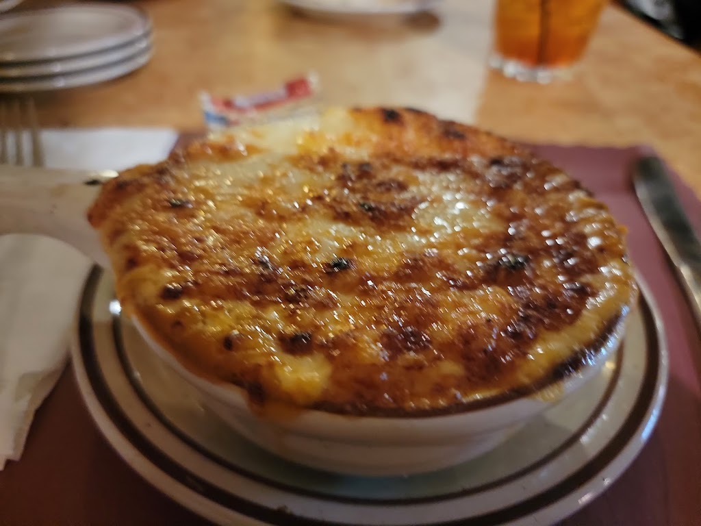 The baked french onion soup was very good as well as our main dishes. The service, atmosphere all good.