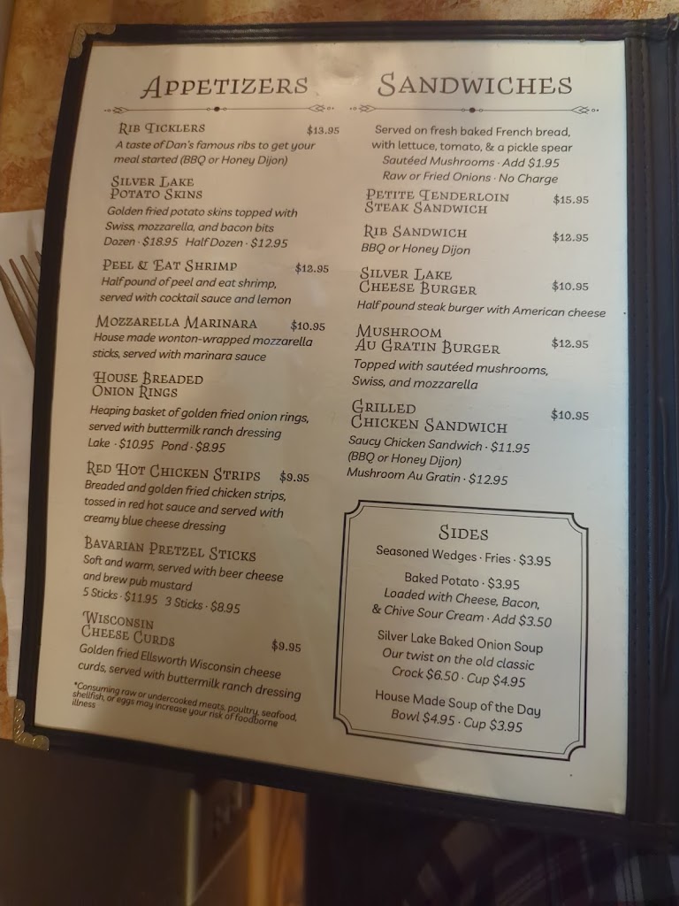 The Ribeye steak was excellent and the French Onion soup very good. Nora was my server and she was the best. The atmosphere took many decades to achieve. You'll be glad to dine or drink at Silver Lake County Inn.