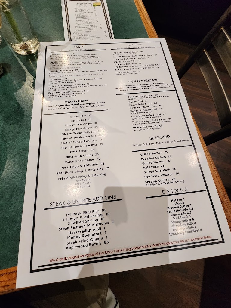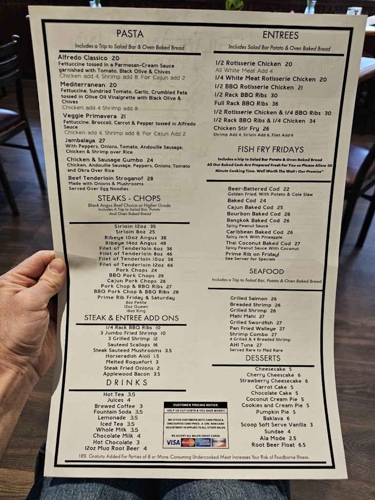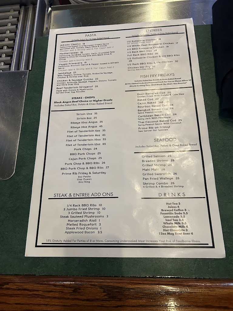 We were here early on a Saturday night. Simple but good...again, nothing fancy, but good quality. Started with a salad bar, cup of chicken dumpling soup and fresh baked bread. Good and filling. We ordered a 14oz ribeye...it was delicious. Garlic mashed potatoes...good. Nothing from the bar...we will be back!