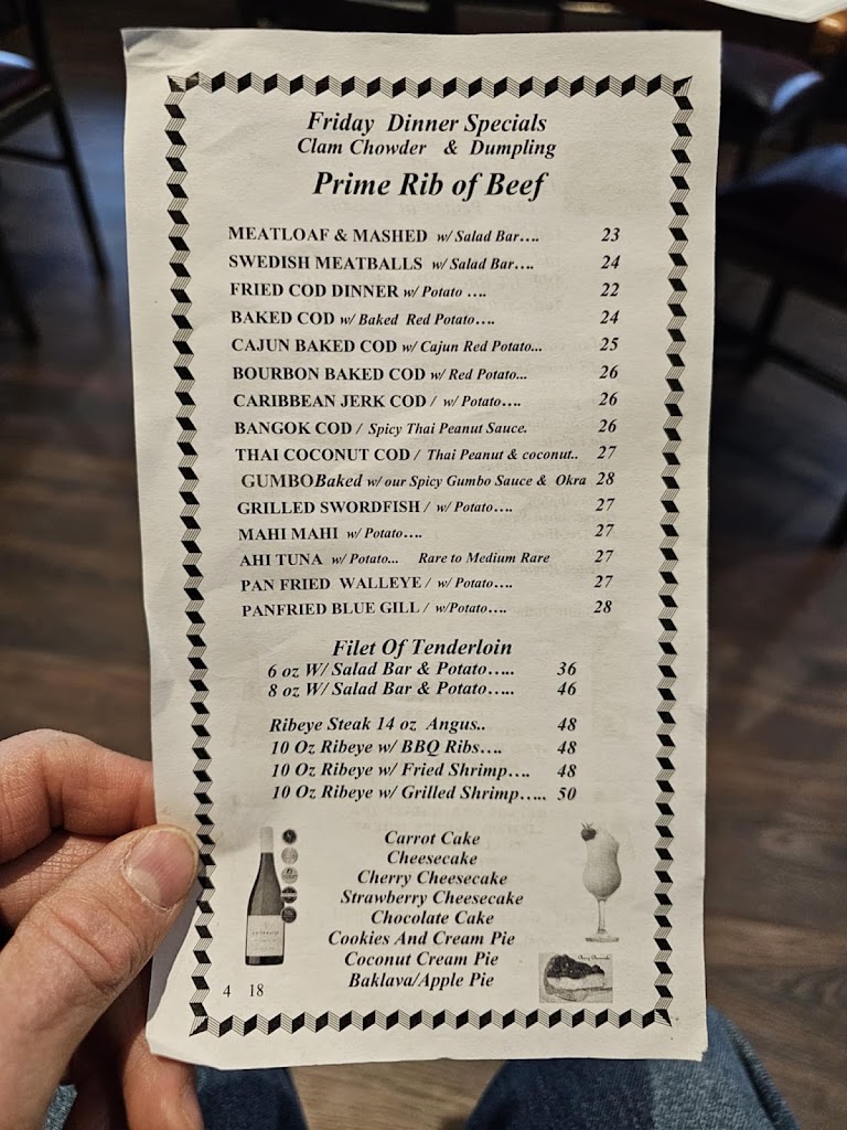 Started off with an old fashioned that was spot on and it just got better! Warm loaf of bread with our dinners, delicious chicken dumpling soup, my husband opted for the salad bar (YES a salad bar!), good spinach artichoke dip with warm garlic bread slices for an appetizer (like we needed more bread :)). Since it was a Friday, we both had fish. I had fried cod and a baked potato and my husband had baked Caribbean Jerk with potato pancakes. Just delicious and generous portions. All served up with the friendliest of bartenders (we sat at the bar).