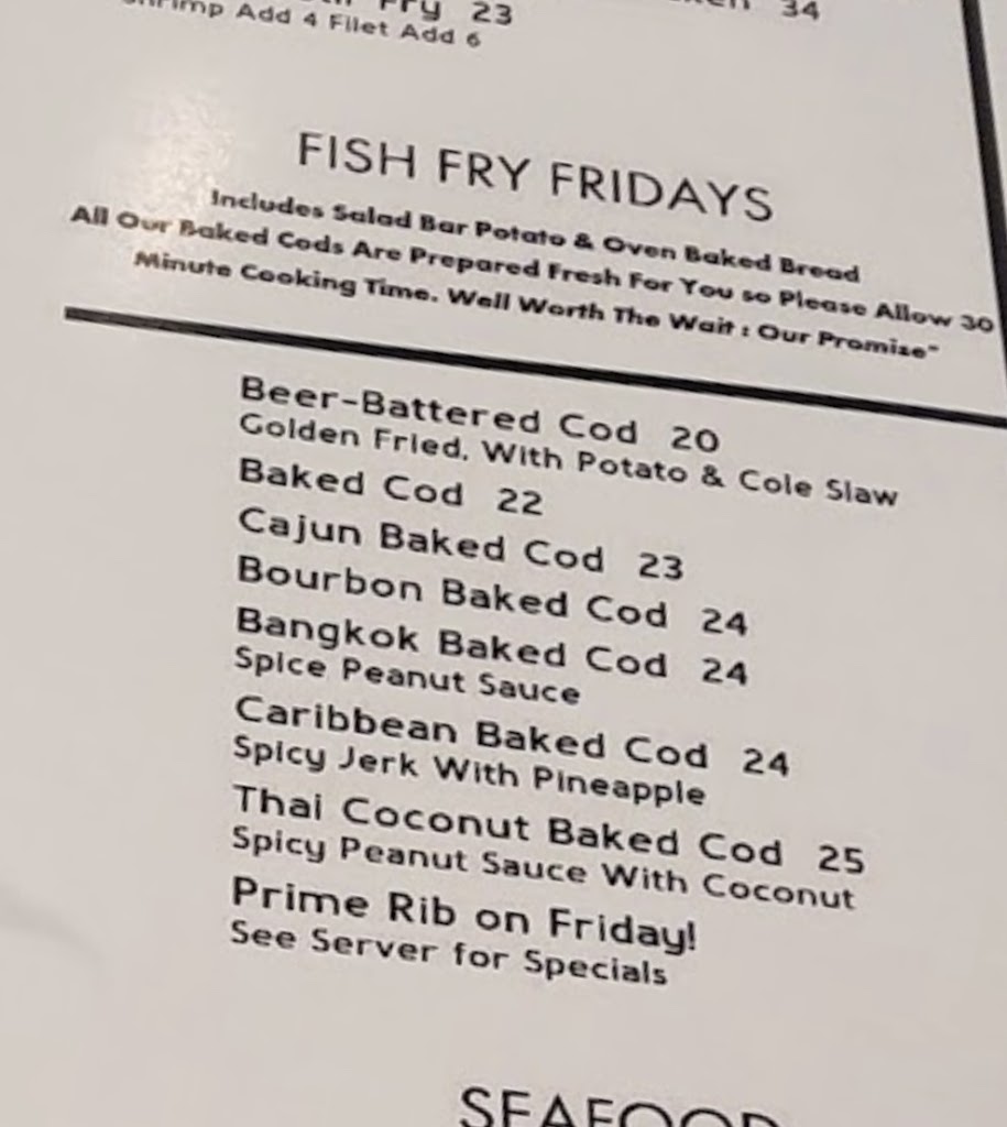 We went for a Fish Fry and the food was outstanding. I had the Bangkok Cod which was outstanding. My husband had the gumbo cod and again it was great. The salad bar had a wonderful selection and for those who could also fit in the Clam Chowder it was very tasty. I couldn't believe how very happy and outgoing every member of the staff was, they went out of their way to smile, say a greeting, thank us for coming. One of the best dining experiences we've had in a long time.
