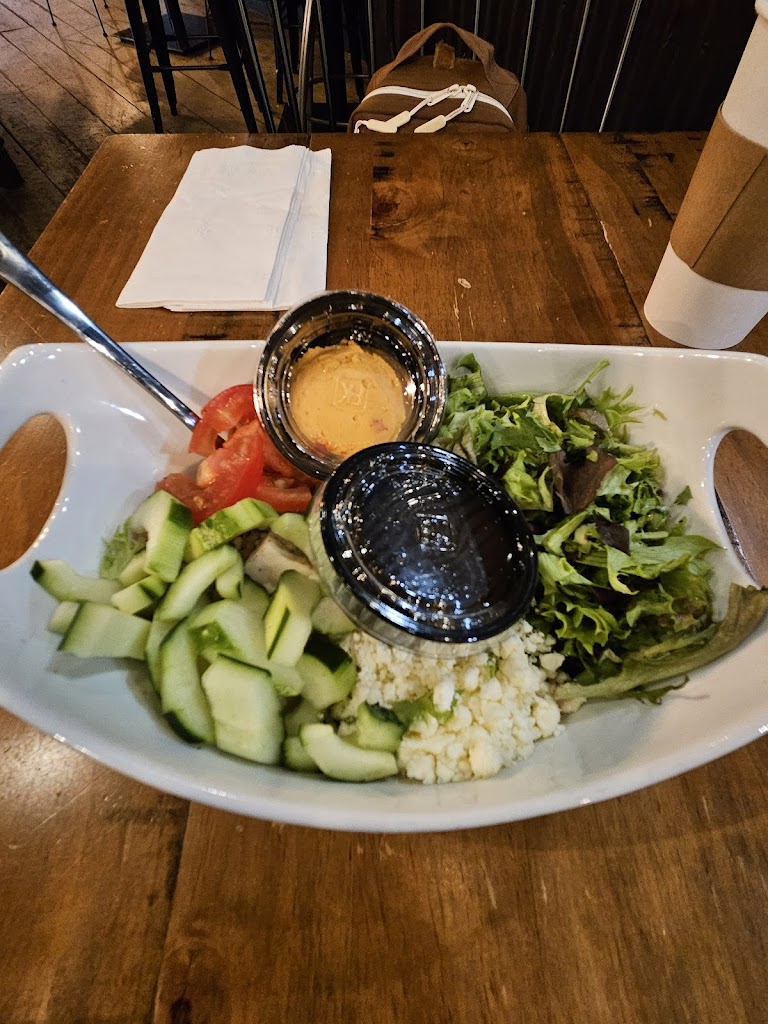 The Greek Salad with grilled chicken is incredible and huge! Had it last week and had to go back for it again today.
