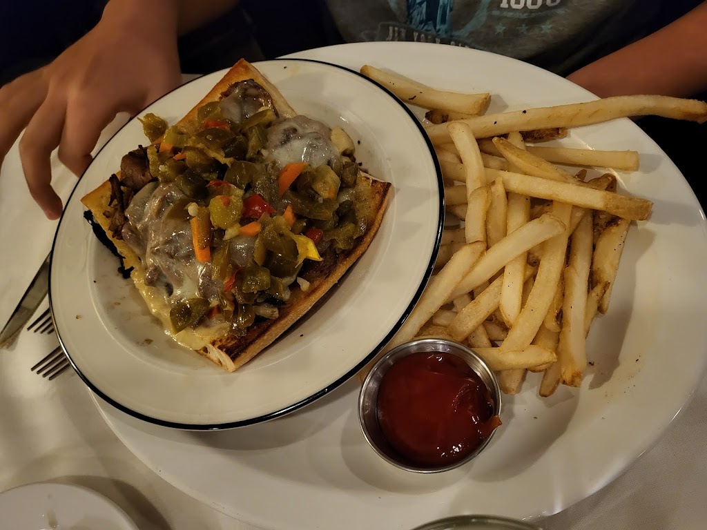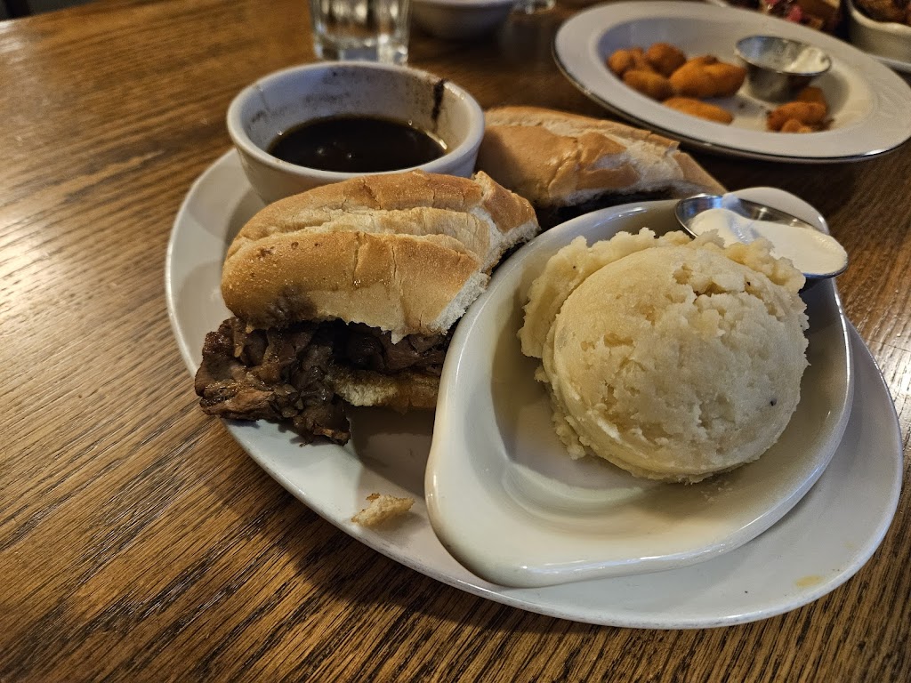 The French dip i had was good, and the place has a good atmosphere but the girlfriend had the salmon and everything about that plate was disgusting. Worst salmon I ever tried. The roasted garlic spread is not good. Definitely don't wanna eat that either. First and last time for me at this establishment.