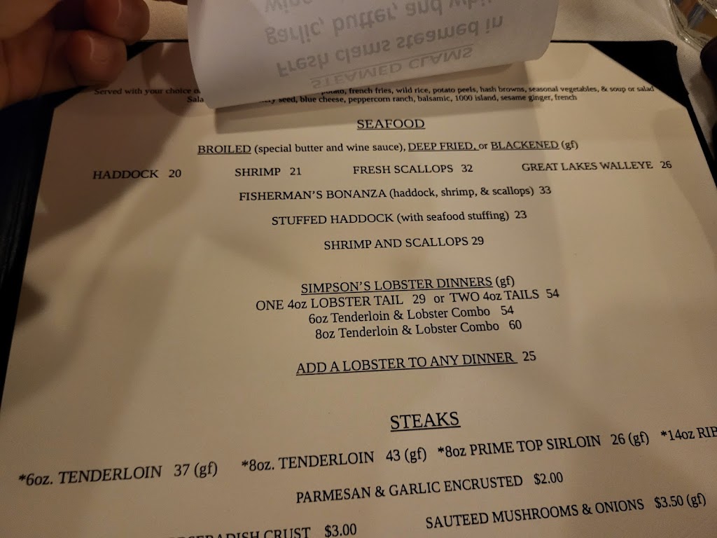 Super food. Great choices on seafood prepared many ways. I tried the stuffed haddock. Mmm. My partner had a halibut dish that was a special. We have never been disappointed at Simpson’s. Give it a try