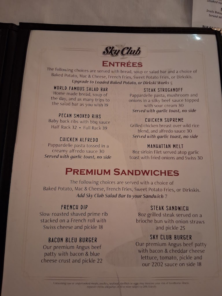 Sky Club is apparently the inventor of the salad bar (1950! 🫢) and it shows. The selection is huge and the items are fresh and tasty. The rest of the menu is decent as well. Our group has had the prime rib, chicken Alfredo, the french dip and fish fry. Each dish was cooked fresh upon order (prime rib, not withstanding) and the pasta appeared to be (& tasted) homemade.