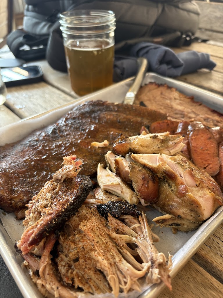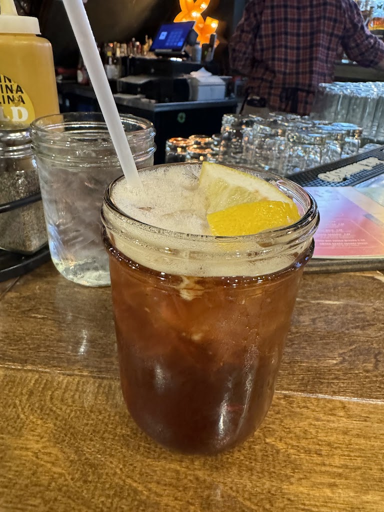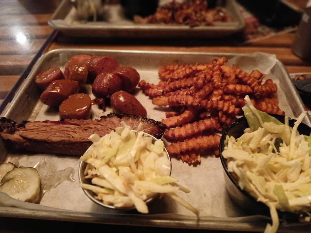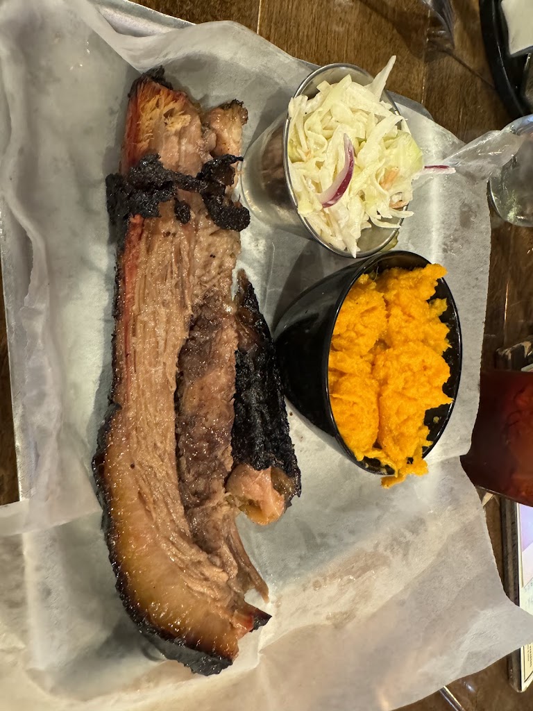 I ordered the brisket plate with a side of sweet potato mash, a side of cheese curds and fried pickles and a prohibition iced tea. The iced tea didn’t taste much like alcohol but it was refreshing because inside wasn’t really well ventilated. The sweet potato mash and coleslaw had no flavor and the brisket was so dry (except for the fatty part).