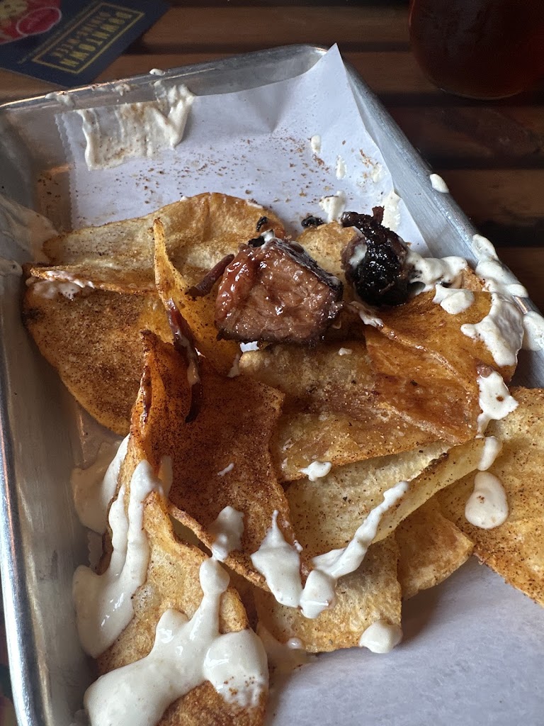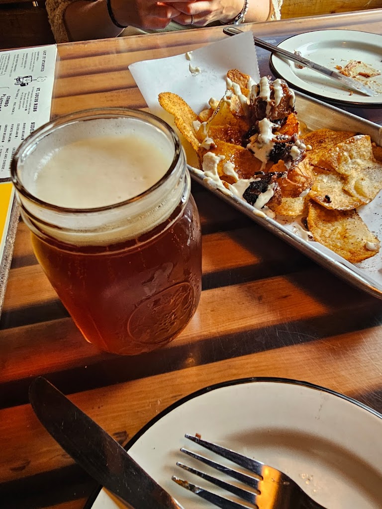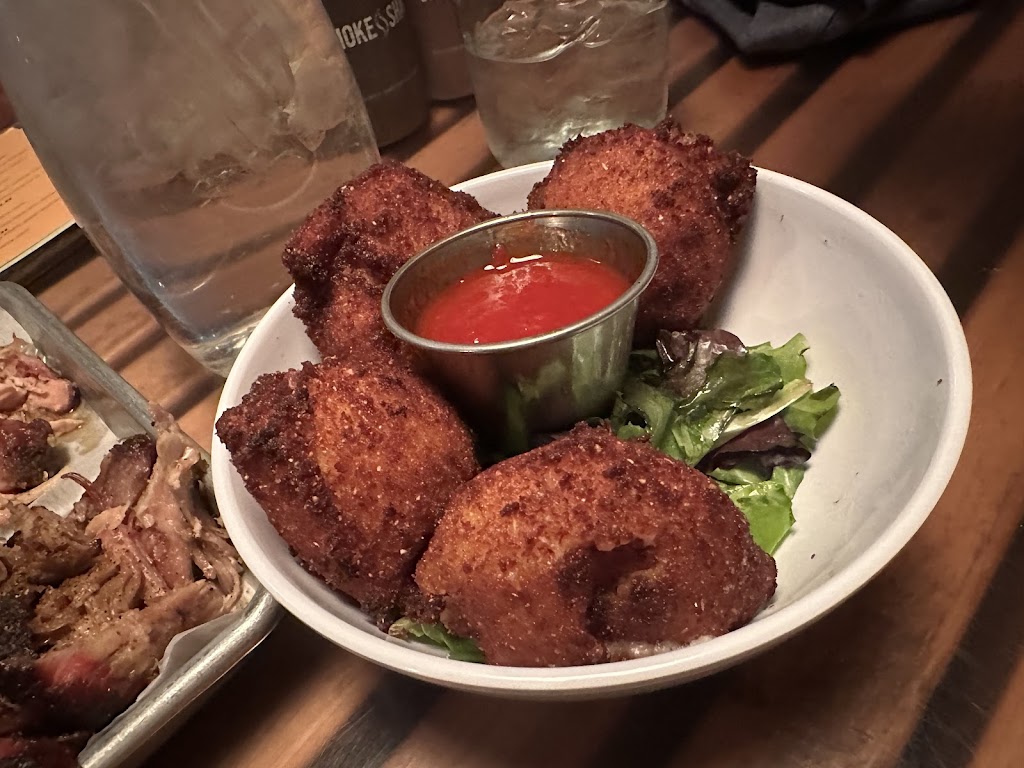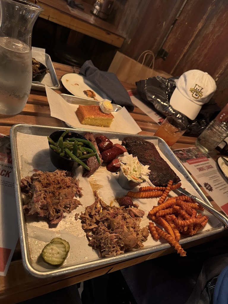 I ordered the brisket plate with a side of sweet potato mash, a side of cheese curds and fried pickles and a prohibition iced tea. The iced tea didn’t taste much like alcohol but it was refreshing because inside wasn’t really well ventilated. The sweet potato mash and coleslaw had no flavor and the brisket was so dry (except for the fatty part).