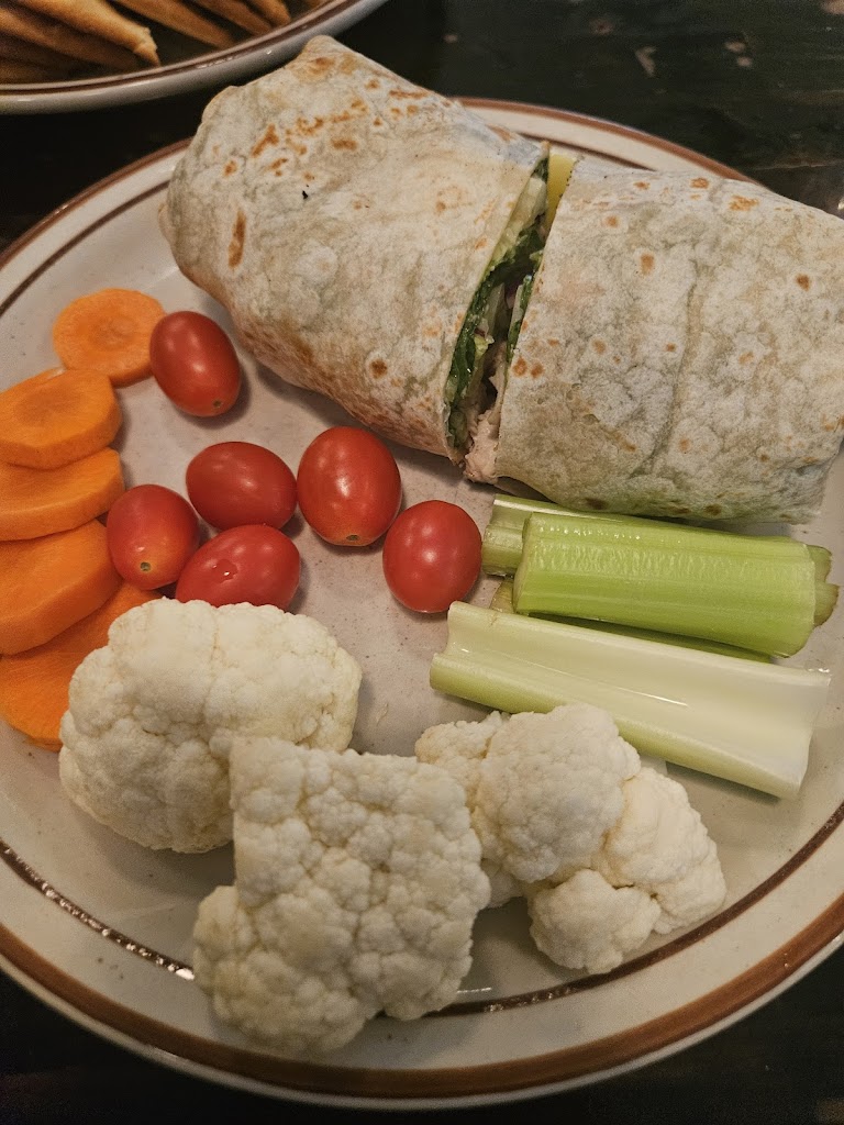 I had the chicken Caesar wrap which was very good. Large, warm chunks of chicken, and the dressing I believe was homemade. Bits of pine nuts in the wrap gave it some interesting texture. I had the side of raw veggies which was nothing special, as you can see by the photo. Chunks of cauliflower, celery, carrots and grape tomatoes haphazardly on the plate. Totally non-appetizing.