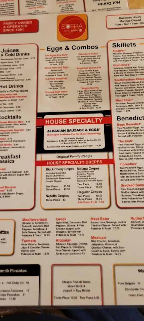 The Albanian sausages are unique and yummy breakfast side. Menu is diverse without being overwhelming. The service is always good and patient with kids. Overall a really solid dinner experience.
