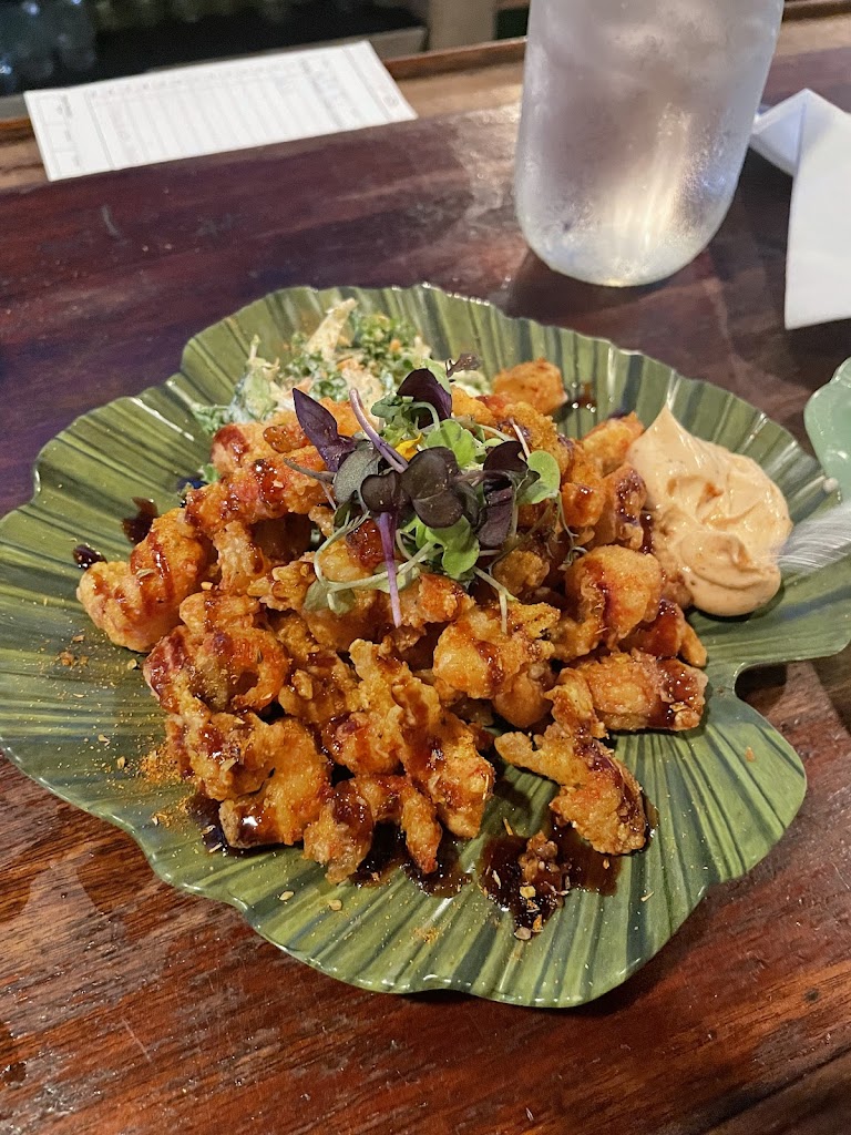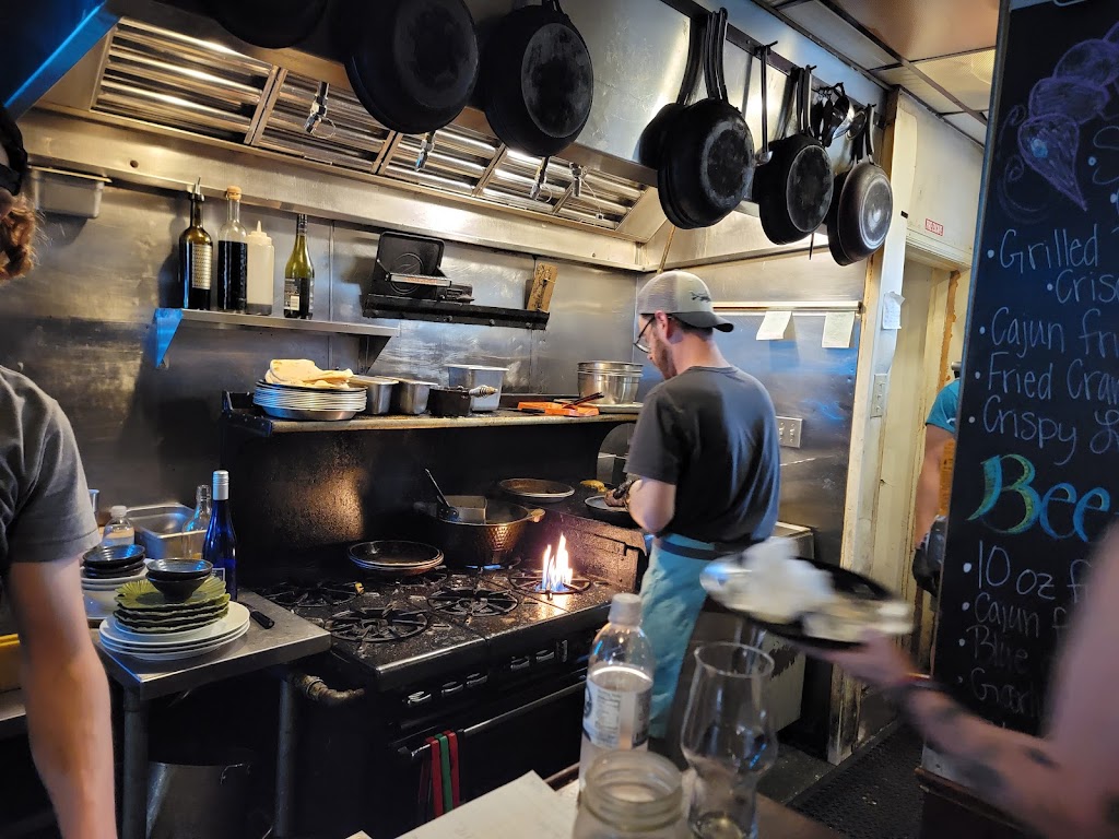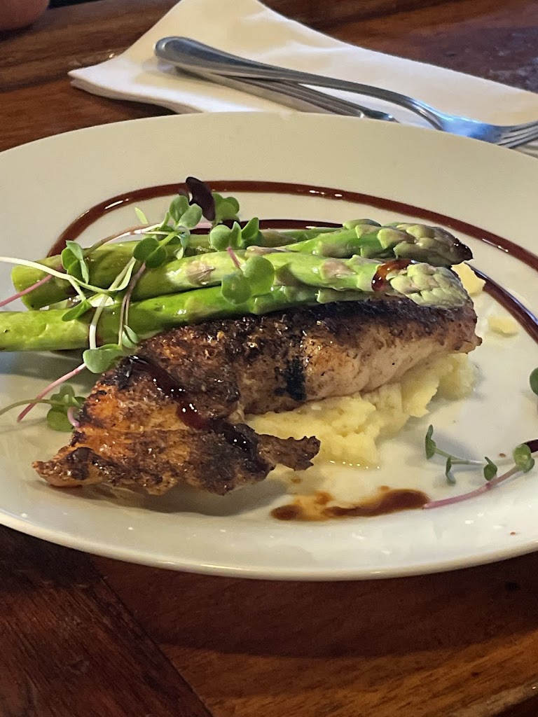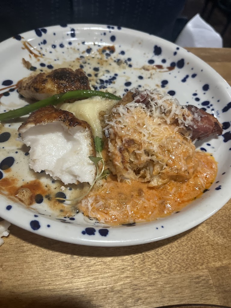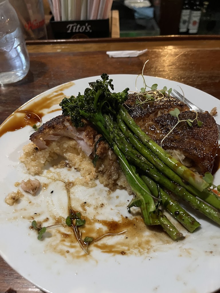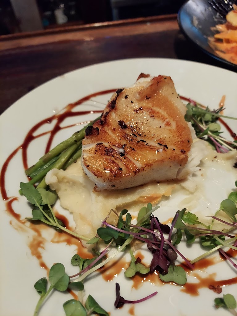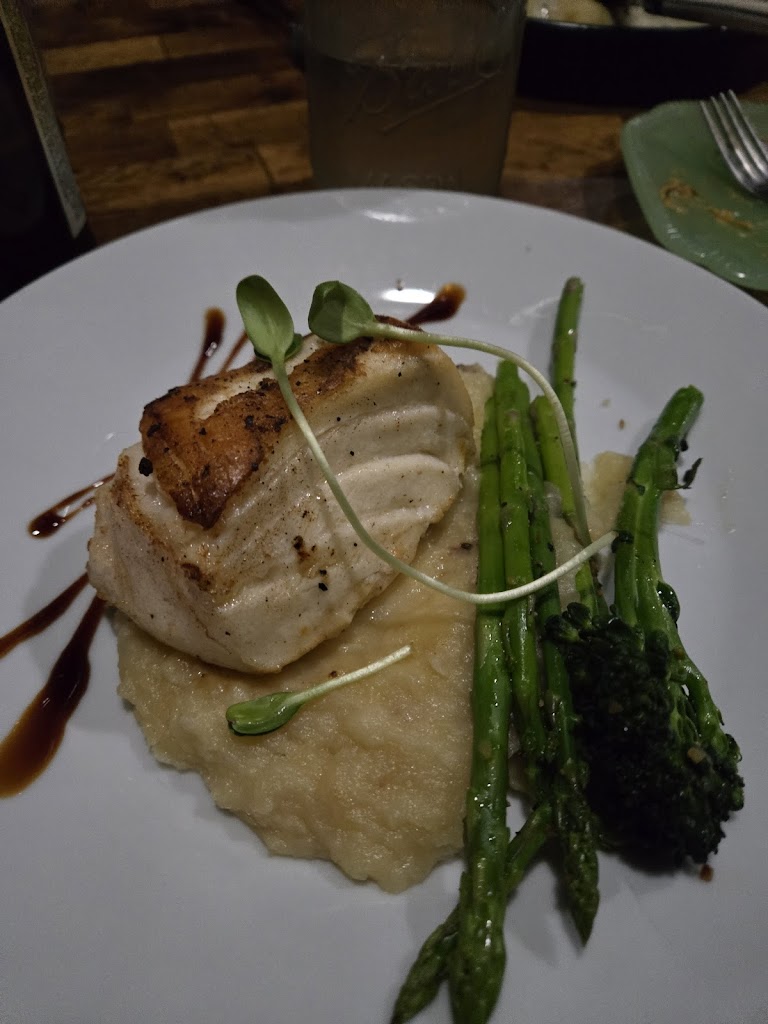 We started with hand-muddled Old Fashioneds crafted by Kavon himself—excellent as always—and snacked on the crispy shrimp appetizer. For dinner, I had the sea bass, and my wife enjoyed the chef’s special: blackened grouper served with a crab cake and grits. The seating arrangement offers a great view of the kitchen, and we loved watching Kavon passionately prepare not only our dishes but those for other guests as well.