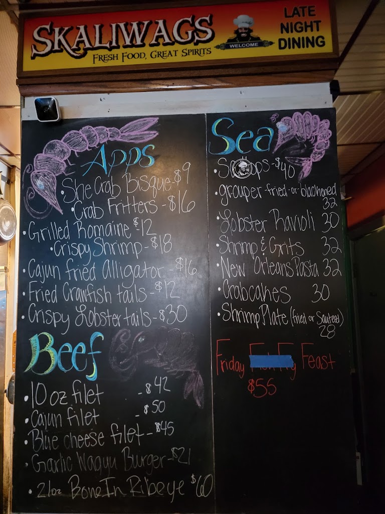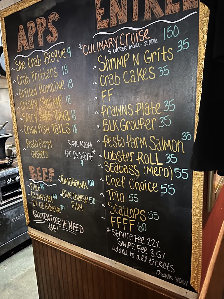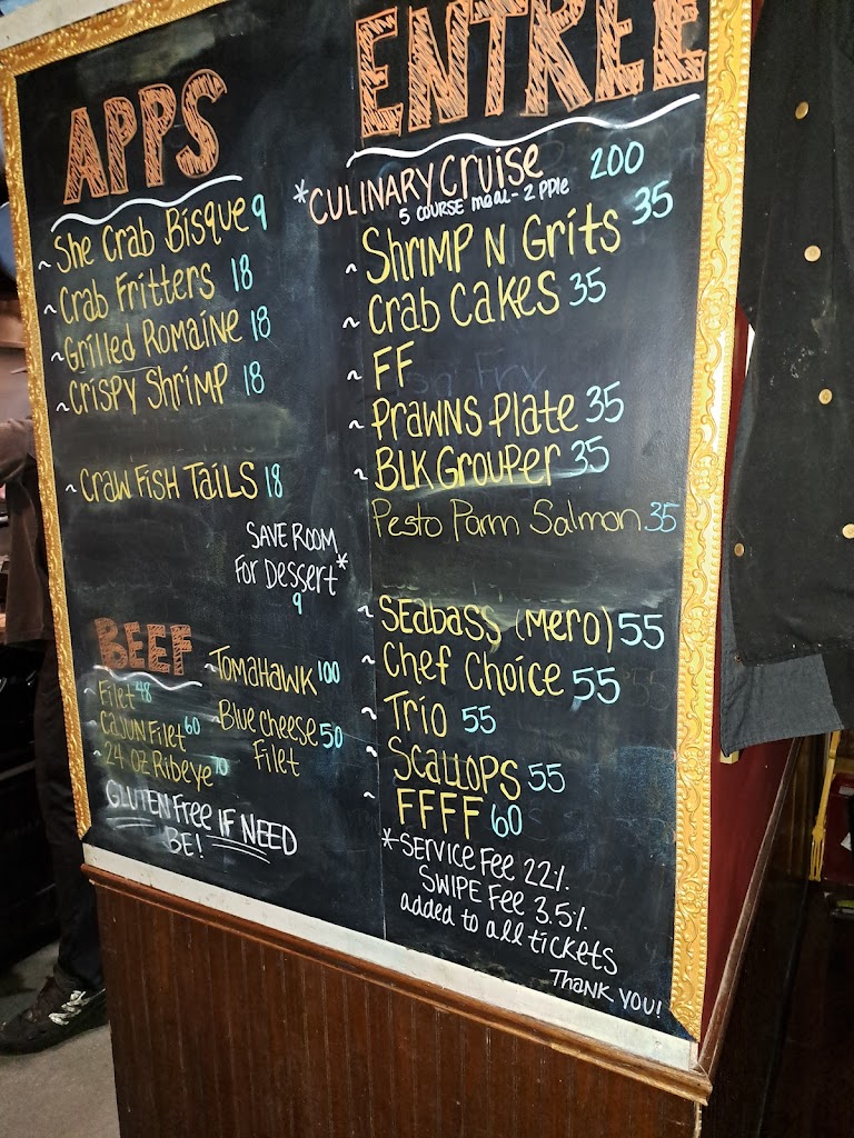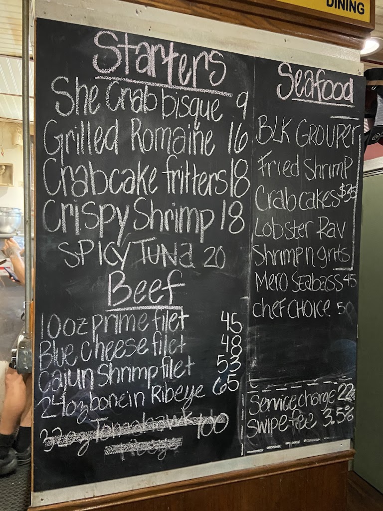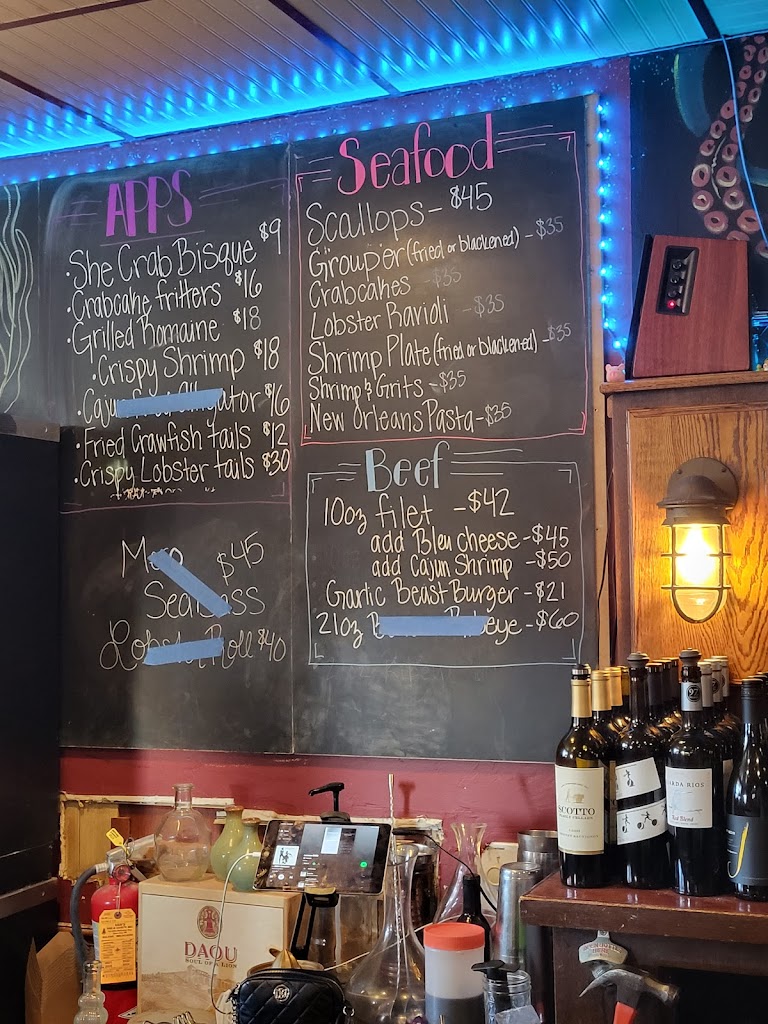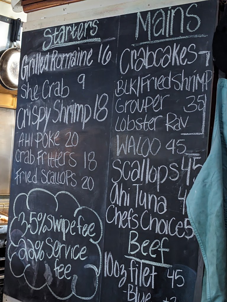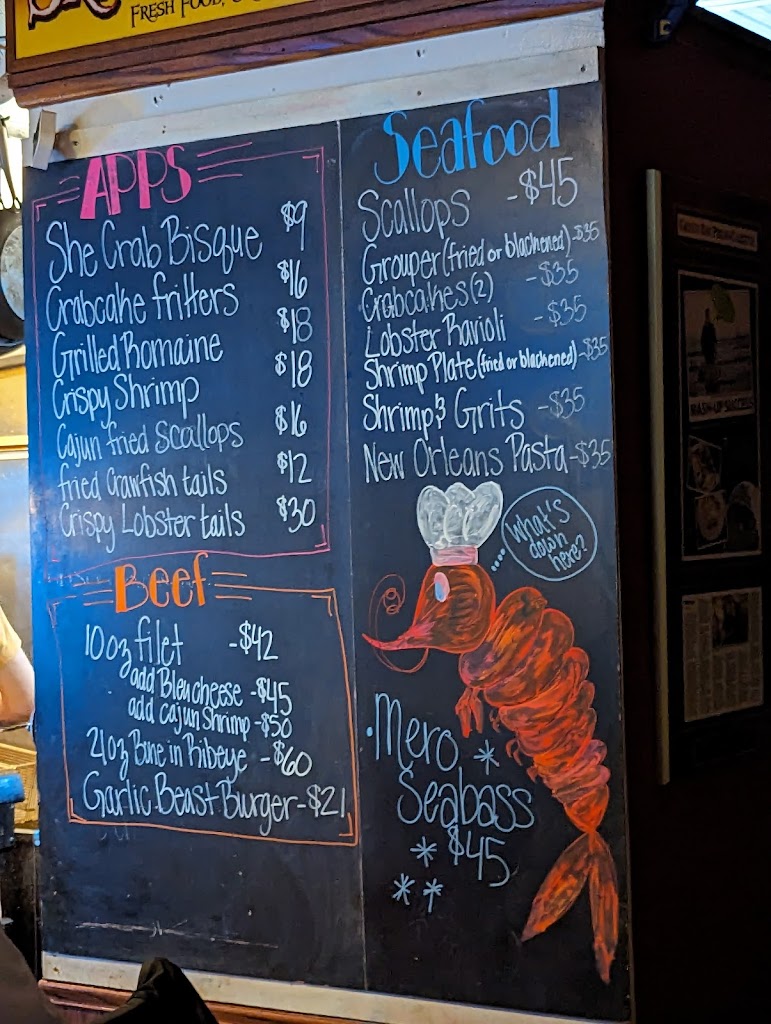 The menu is on a chalkboard presumably because it changes frequently. The seafood is fresh fresh fresh! We dined on a Saturday and they were already out of oysters which were delivered on Friday. They must be good!! We will definitely be back!