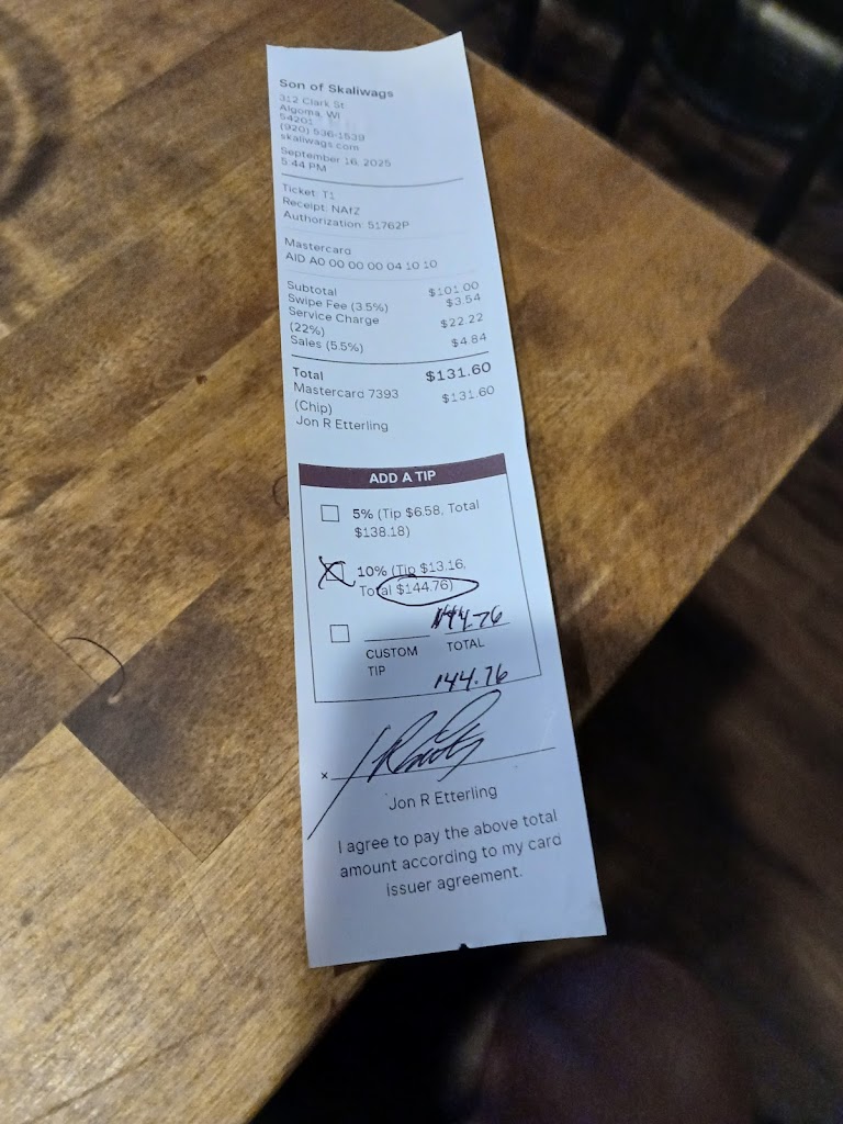 Interesting experience at Son of Skaliwags, which was highly recommended to us. We made a reservation for 6pm, but that was worthless as we were not seated until 6:40. The atmosphere was good, like a dive bar with upscale food choices. Once seated, it took forever for someone to ask for our drink order, then even longer to get someone to take our food order. The blackened grouper was ok at best, probably not a good idea to order an ocean fish in Wisconsin. The bill came and there was a 22.5% tip pre-added to the order, which was crazy based on the bad service. Maybe it was just an off night for the place, but definitely not worth the drive to go there again.