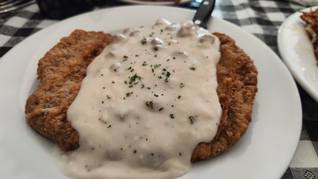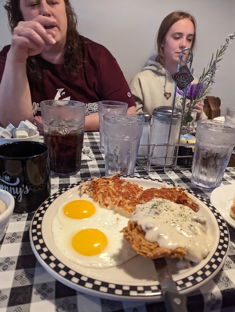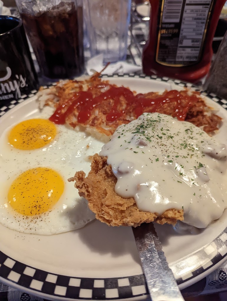 I had country fried chicken with 2 eggs sunny side up and a side each of hash browns and half order of biscuits with that sumthin'sumthin' sausage gravy. Yum.