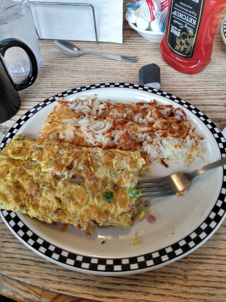 Lisa had a ham omelette, well done with hash browns and wheat toast.