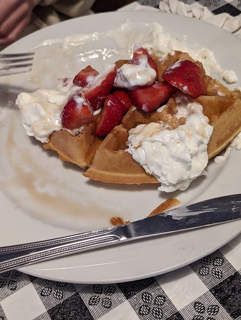 Bree had chicken and waffles with maple syrup, and Brynne-ie Boo had the strawberry waffles (of course) with fresh strawberries and whipped cream.