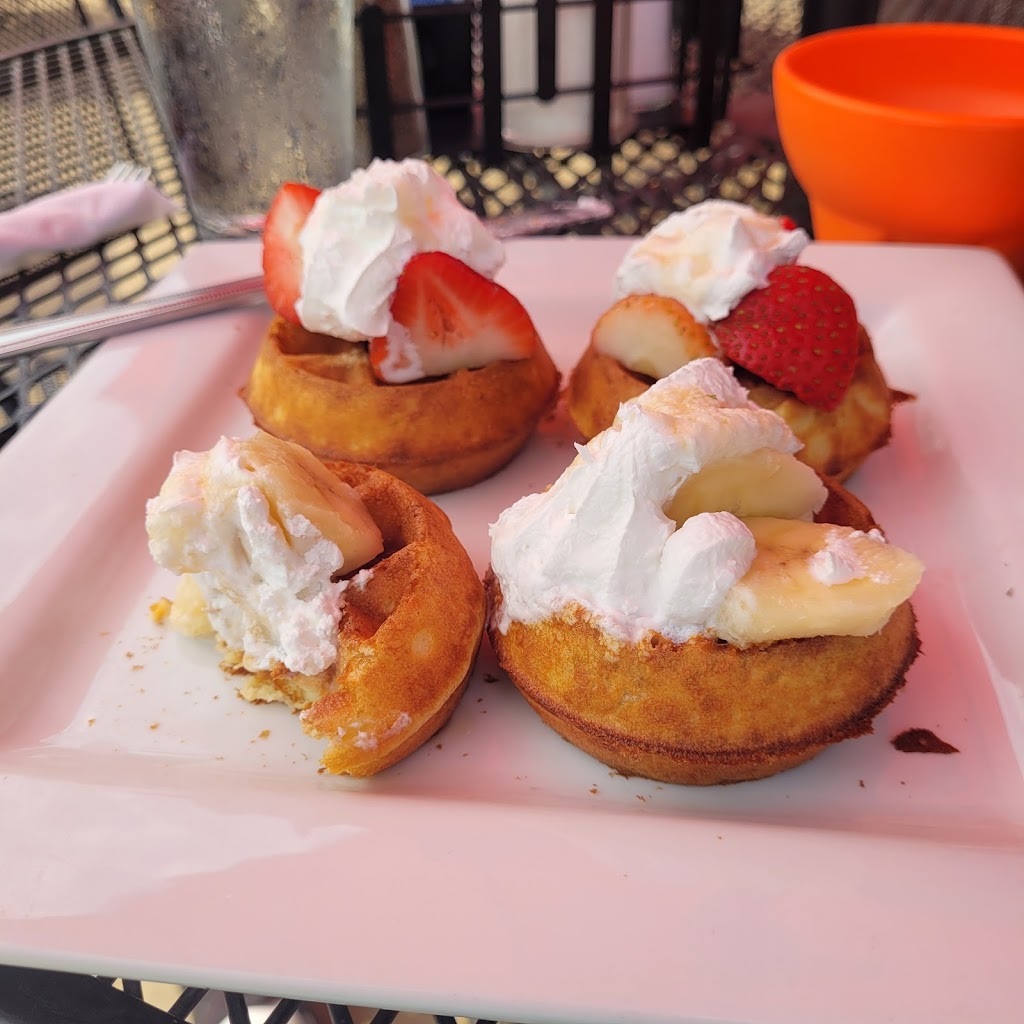 Could have had the cardboard breakfast at our hotel. Pictures really get me going. Saw the mini waffles with cut fruit and it embedded into my brain. We checked out of our hotel and drove here. The closest table outside on the sidewalk was perfect for us. The slight breeze added to the effect. Yes the coffee was great slowly making us realize the weekend was winding down. The light breakfast hit the spot. A great experience of a really great weekend for to old seniors. We will be back to add to our constant memories.