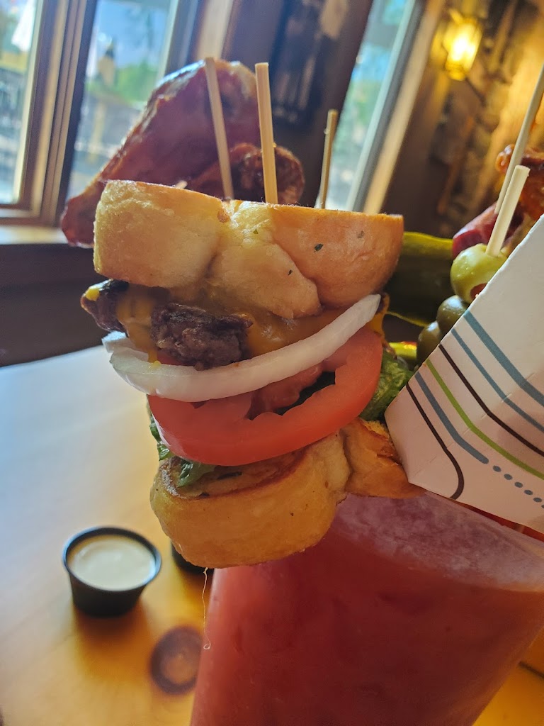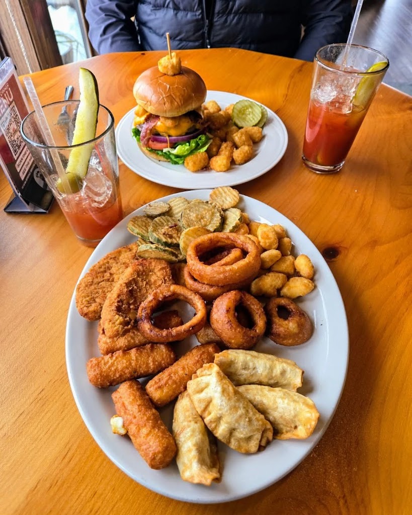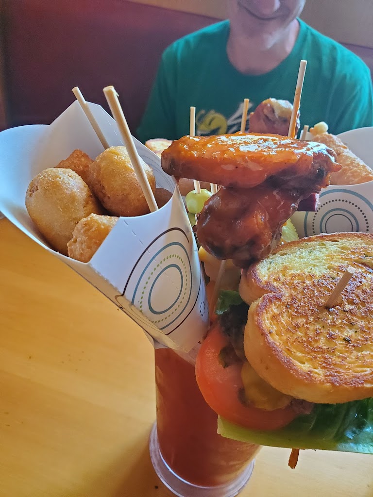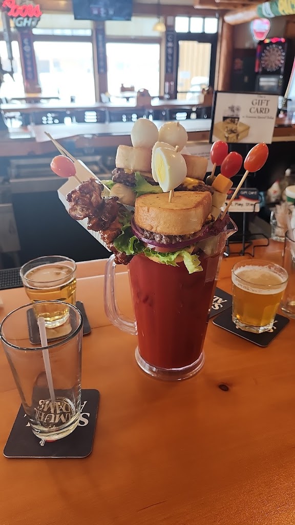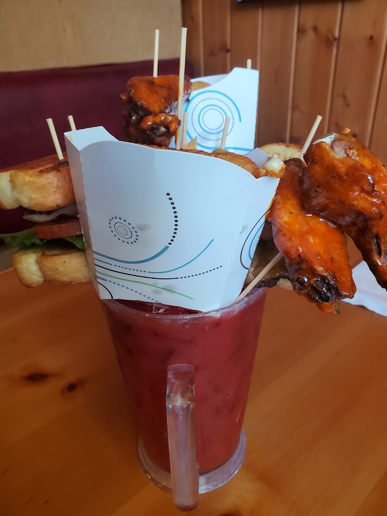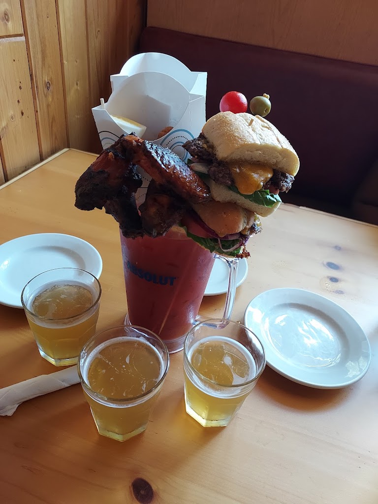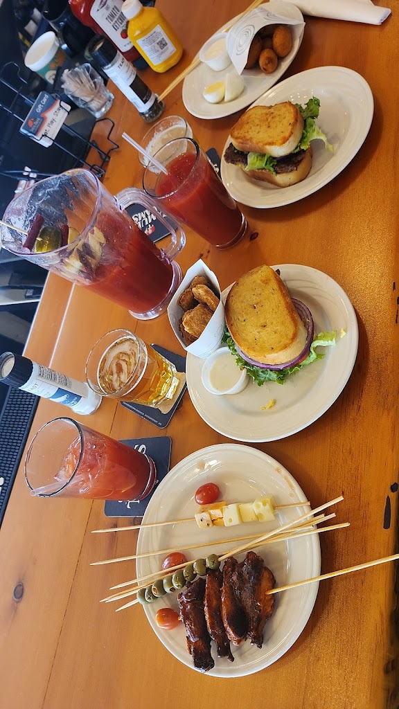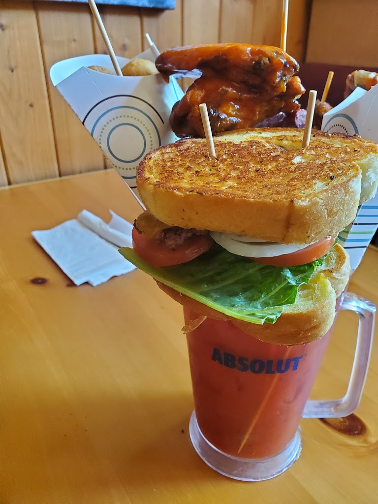 We came in and Tina made us feel welcome and we came in for the amazingly huge Bloody mary. The grilled toast bread for the 2 burgers is a great idea! also other snacks on board chicken nuggets and mini corn dogs as well as chicken wings and cheese and sausages . It came with two chasers. If say a great deal for us two!