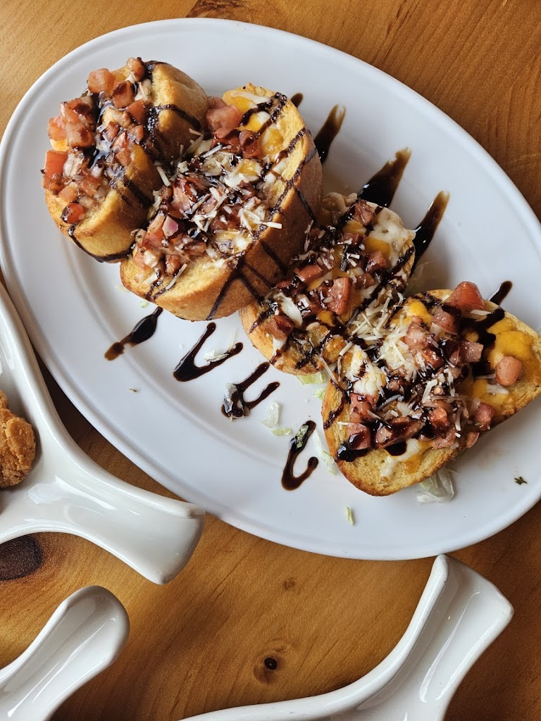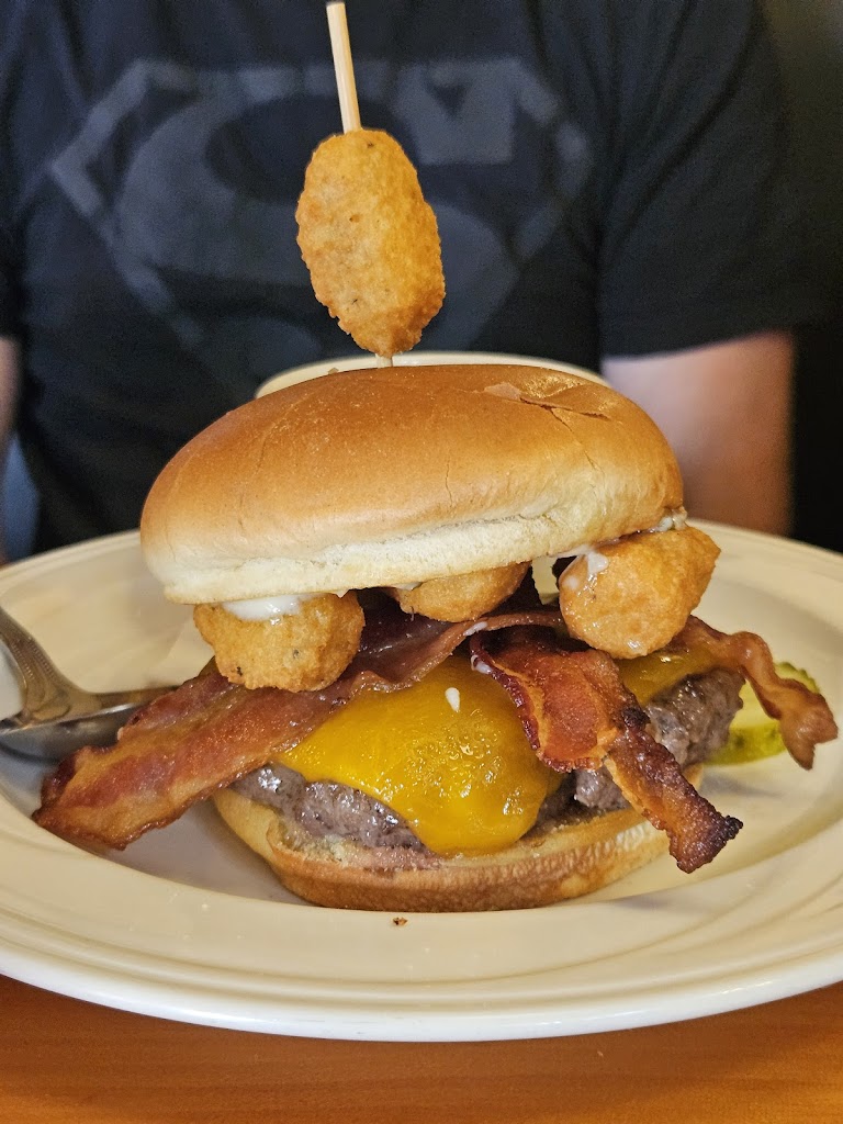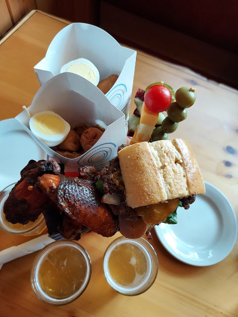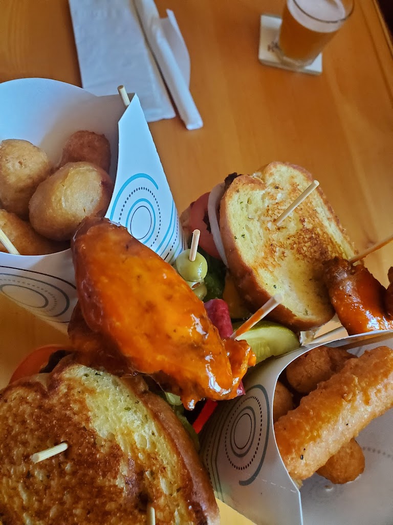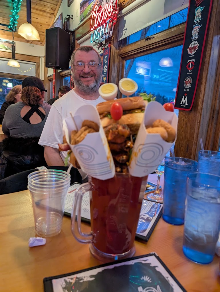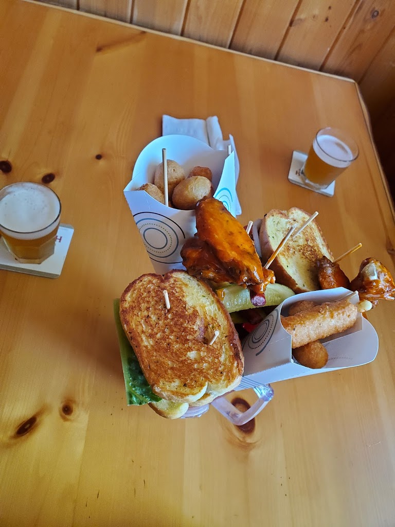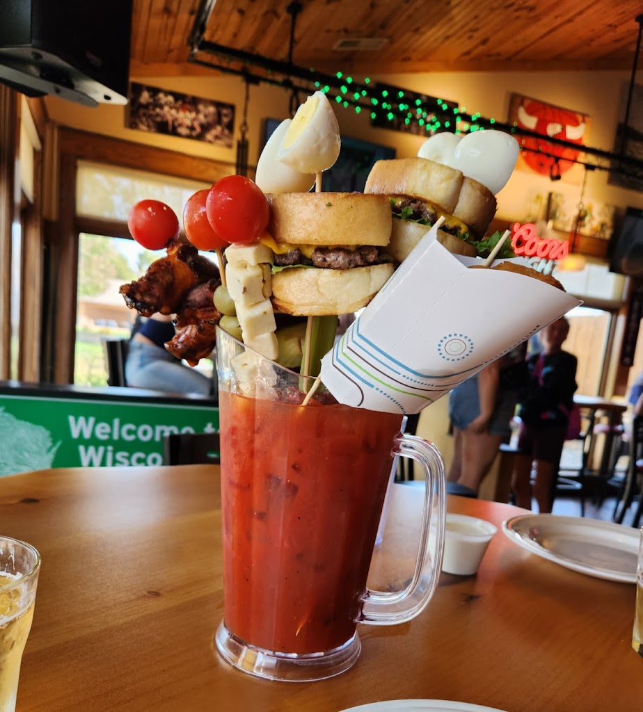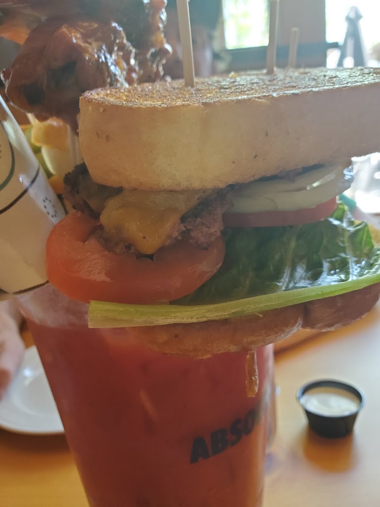 We came in and Tina made us feel welcome and we came in for the amazingly huge Bloody mary. The grilled toast bread for the 2 burgers is a great idea! also other snacks on board chicken nuggets and mini corn dogs as well as chicken wings and cheese and sausages . It came with two chasers. If say a great deal for us two!