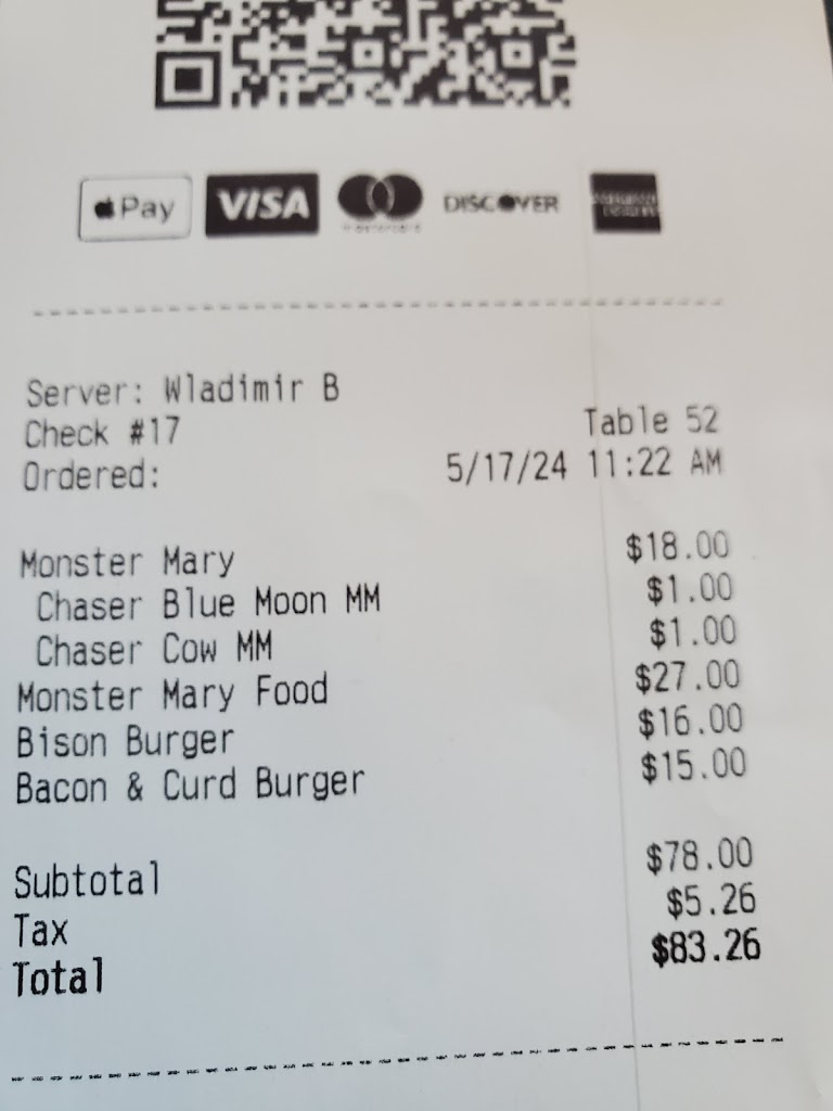 Went there for the ultimate bloody mary and loved the whole place. Will definitely be back to try some other menu items. The bartender was very friendly and attentive.